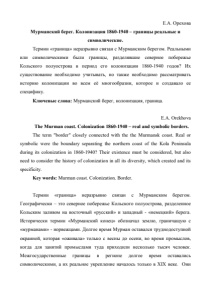 Е.А. Орехова Мурманский берег. Колонизация 1860-1940 – границы реальные и символические. Термин «граница» неразрывно связан с Мурманским берегом. Реальными или символическими были границы, разделявшие северное побережье Кольского полуострова в период его колонизации 1860-1940 годов? Их существование необходимо учитывать, но также необходимо рассматривать историю колонизации во всем её многообразии, которое и создавало ее специфику. Ключевые слова: Мурманский берег, колонизация, граница. E.A. Orekhova The Murman coast. Colonization 1860-1940 – real and symbolic borders. The term "border" closely connected with the the Murmansk coast. Real or symbolic were the boundary separating the northern coast of the Kola Peninsula during its colonization in 1860-1940? Their existence must be considered, but also need to consider the history of colonization in all its diversity, which created and its specificity. Key words: Murman coast. Colonization. Border. Термин «граница» неразрывно связан с Мурманским берегом. Географически – это северное побережье Кольского полуострова, разделенное Кольским заливом на восточный «русский» и западный - «немецкий» берега. Исторически термин «Мурманский конец» обозначал землю, граничащую с «мурманами» - норвежцами. Долгое время Мурман оставался труднодоступной окраиной, которая «оживала» только с весны до осени, во время промыслов, когда для занятий промыслами туда приходили несколько тысяч человек. Межгосударственные границы в регионе долгое время оставались символическими, а их реальное укрепление началось только в XIX веке. Они