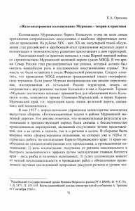 Е.А. Орехова «Железнодорожная колонизация» Мурмаиа —теория и практика Колонизация Мурманского берега Кольского п-ова на всем своем протяжении сопровождалась дискуссиями о наиболее эффективных мето­ дах ее проведения. На рубеже XIX - нач. XX вв. популярной темой обсуж­ дения стал российский и зарубежный опыт привлечения железных дорог к колонизации и экономическому развитию прилегающих к ним территорий. Реализация идей на практике началась в годы Первой мировой войны со строительством Мурманской железной дороги (далее МЖД). В это вре­ мя Север России стал рассматриваться как регион, который должен был сыграть важнейшую роль в послевоенном восстановлении страны1. Эта мысль не была оставлена и после Февральской революции. Следует отме­ тить, что проведение МЖД изменило традиционный смысл географиче­ ских терминов. Если ранее Мурман воспринимался как вполне определен­ ная, изолированная от остальной России территория, теперь он соединяется с внутренними частями Кольского п-ова и Карелией. Термин «Мурман» постепенно начинает применяться для обозначения всего Коль­ ского п-ова, появляется термин Олонецко-Мурманский, и позже Карело- Мурманский край, т.е. территория вдоль линии железной дороги, связан­ ная с ней экономически. В мае 1917 г. переселенческое управление министерства земледелия выпустило сборник «Колонизационные задачи в районе Мурманской же­ лезной дороги». Его авторы отметили, что незначительные результаты ко­ лонизации в предшествующий период были связаны с бессистемностью проводившихся мероприятий, вызванной отсутствием четких представле­ ний, как о ее целях и задачах, так и о регионе в целом. В сборнике были впервые четко сформулированы положения, на которых уже в 1920-е гг. строилась работа по колонизации Карело-Мурманского края: 1) краю не­ обходима не сельскохозяйственная или промысловая, а промышленная ко­ лонизация; 2) цель колонизации: получение от региона максимального и быстрого экономического эффекта путем эксплуатации главных богатств края - леса, рыбы и полезных ископаемых; 3) успех колонизации зависит от четкой последовательности в проведении работ с обязательным прове­ дением научных исследований природных ресурсов региона и уровня эко­ 1Российский Государственный архив Военно-Морского флота (РГА ВМФ). Ф. 418. Оп. 1. Д. 5171. Л. 153-155. Всеподданнейший доклад министра путей сообщения А. Трепова от 1 октября 1916г. 71