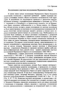 Е.А. О рех ова Колонизация и научные исследования Мурманского берега В самом своем начале колонизация Мурманского берега Кольского полуострова столкнулась с серьезной проблемой - крайне скудными зна ниями о географии, климате, общем положении и возможностях этой терри тории. В дальнейшем это неоднократно приводило к различным казусам. Возникала путаница с географическими названиями и пунктами, до 1870-х гт. чиновники и в Петербурге и в Архангельске полагали, что на Мурман ском берегу возможно хлебопашество и т.д. Нельзя сказать, что Мурман был «белым пятном» на карте, однако посещавшие его научные экспедиции не были ориентированы на изучение его колонизационных возможностей. В целом отсутствие соответствующих знаний о регионе в течение всего пе риода колонизации препятствовало ее успешному ходу. Необходимость его изучения была очевидна, но власти постоянно сталкивались с нехваткой персонала, способного собрать и обработать нужные материалы. Для прове дения колонизации Мурмана не было создано специальных ведомства, не было также ни одного чиновника, непосредственно занимавшегося бы эти ми вопросами. Регулярные статистические данные, представлявшиеся в гу бернию полицейскими и церковными властями, были разнородными и да леко не всегда точными. Затрудняли процесс изучения и объективные факторы - отдаленность Мурмана от городских центров и крайне слабо раз витая инфраструктура. Цель данной статьи - выявить взаимосвязь научных исследований Мурманского берега и его колонизации в 1860-1940 гт. Информация о первых результатах колонизации стала поступать в Архангельск в 1863-1864 гг. в рапортах полицейских властей Кемского уезда (исправника и пристава 5-го стана), проводивших инспекции состоя ния колоний Мурмана. Их результатом стал ряд предложений со стороны местных полицейских властей, посвященных упорядочению юридических и экономических аспектов жизни колонистов. Первое известное исследование, которое было связано непосредст венно с перспективами развития колонизации, и проводилось по опреде ленной программе, было проведено в 1866 г. Для исследования и описания северо-западной части Мурманского берега во время навигации была соз дана специальная комиссия. В нее были командированы Пинежский уезд ный землемер Сонин, лесничий Мельвель, приставы 3-го и 5-го станов Кемского уезда Комповский и Поникаровский. (ГААО. Ф.71. Оп.1. Т.1. Д. 225а. Л. 47, 77-78). Комиссия получила инструкцию, в соответствии с ко торой ей надлежало исследовать быт колонистов и лопарей, составить кар ту Западного Мурмана, определить возможные места для новых поселений с сенокосами и огородами, собрать сведения о «причинах столкновения русских промышленников с норвежцами на пограничной черте и о само 41