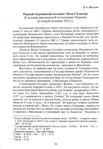 Е.А. Орехова Первый мурманский колонист Яков Гиландер (К истории финляндской колонизации Мурмана во второй половине XIX в.) Колонизация Мурманского берега Кольского п-ова официально на чалась 31 августа 1860 г. Первым законодательным актом, относящимся к колонизации Мурманского берега, стало Положение комитета министров «О дозволении норвежцам переселяться в бывший Кольский уезд Архан гельской губернии» (31 августа 1860 г.)1. Однако значительную часть ко лонистов Мурманского берега впоследствии составили выходцы из Вели кого княжества Финляндского. Личность Якова Гиландера в истории колонизации Мурманского бе рега Кольского п-ова весьма примечательна, хотя на Мурмане он провел всего около 8 лет. Это первый переселенец, чье появление на побережье было зафиксировано как в документах, так и в сообщениях современников. Кроме того, обстоятельства его переселения и жизни на Мурмане стали типичными для большинства колонистов - выходцев из Финляндии. Воссоздать, по крайней мере частично, историю Я. Гиландера позво ляют документы, сохранившиеся в Государственном архиве Мурманской области и Государственном архиве Архангельской области2. Это не только документы, выданные русскими властями, но и полученные Гиландером на местах его прежнего проживания - в Финляндии и Норвегии. Самый ранний документ, связанный с Яковом, - удостоверение о пе реезде, выданное епархией Куопио в 1859 г. Из документа следует, что пе реселенец Johan JakobMariasson Hiukka или Niemela3, родившийся в 1830 г., его жена Eva Kaisa Abramsdotter (1822 г.р.) и сын Карл Вильгельм (1857 г.р.) направляются в приход Утсйоки4. Из показаний самого Якова известно, что он родился в приходе Кеми, «откуда выбыл в приход Мония Ниска на 19 году от роду, где и женился»5. Из прихода Утсйоки семейство выехало в норвежский г. Вадсе. По словам самого Гиландера, «переезд на жительство основан был на добром моем желании вследствие неурожайно го времени в Финляндии и угрожавшей чрез то бедности»6. Неурожаи и 1Полное собрание законов Российской империи (далее - ПСЗРИ). - Собрание второе. - Т. XLII. Дополнение к XXXV тому второго Собрания законов Российской империи. - 1 8 6 0 .-№ 36122а. 2 Государственный архив Мурманской области (далее - ГАМО). - Ф. И-24. - Оп. 1. - Д. 7; ГААО. - Ф. 1. - Оп. 5. - Д. 829. 3 В финском варианте - Juho Jaako Hiukka. 4 ГАМО. - Ф. И-24. - Оп. 1 .- Д . 7 .- Л . 12. 5Там же. - Л. 9. 6 Там же. - Л. 29. 50