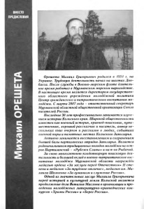Михаил ОРЕШЕТА ВМЕСТО ПРЕДИСЛОВИЯ Орешета М ихаил Григорьевич родился в 1951 г. на Украине. Трудовую деятельность начал на шахтах Д он басса. После службы в Военно-морском флоте длитель ное время работал в Мурманском морском пароходстве. В настоящее время является директором государствен ного областного учреждения молодёжной политики Центр гражданского и патриотического воспитания м о лодёжи. С марта 2007 года - ответственный секретарь Мурманской областной общественной организации Союза писателей России. Последние 30 лет профессионально занимается изуче нием истории Кольского края. Широкой общественности известен как военный историк, краевед-поисковик, путе шественник, хороший рассказчик и писатель, автор не скольких книг очерков и рассказов о лю дях, событиях военной поры и памятных местах Кольского Заполярья. Активно занимается восстановлением и сохранением бывшей базы партизанских отрядов Заполярья. Является родоначальником традиционных походов молодёжи на ост ров Партизанский - ■«Рубежи Славы» и на п-ов Рыбачий. За свою многолетнюю плодотворную поисковую дея тельность и большой вклад в военно-патриотическое вос питание молодёжи Мурманской области награждён медалью ордена -«За заслуги перед Отечеством » II сте пени и медалью «За трудовое отличие», медалью им. М и хаила Шолохова сЗа гуманизм и служение России». Одной из значительных заслуг М ихаила Григорьевича перед историей и культурой зем ли Кольской является продолжение дела Виталия Маслова в организации и про ведении молодёжных литературно-краеведческих кон курсов «Храмы России»- и «Берег России ».