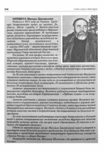 268 Счет слова в Заполярье ОРЕШЕТА Михаил Григорьевич Родился в 1951 году на Украине. Трудо вую деятельность начал на шахтах Д о нбасса. После службы в Военно-морском флоте длительное время работал в Мурман ском морском пароходстве. В настоящее время является директором государствен ного областного учреждения молодёжной по литики Центр гражданского и патриотического воспитания молодёжи. С марта 2007 года - ответственный секре тарь Мурманской областной общественной организации Союза писателей России. Последние 30 лет профессионально за нимается изучением истории Кольского края. Широкой общественности известен как воен ный историк, краевед-поисковик, путеше ственник, хороший рассказчик и писатель, автор ярких зарисовок, шести книг, интересных очерков и рассказов о людях, событиях военной поры и памятных местах Кольского Заполярья. За 30 лет поисковой и военно-патриотической деятельности Михаилом Орешетой совместно с единомышленниками было обнаружено несколько сотен останков советских воинов. За эти годы по его инициативе и с его участием на Кольском полуострове было воздвигнуто 20 памятников и обелисков, уста новлено 38 мемориальных досок. Активно занимается восстановлением и сохранением бывшей базы па ртизанских отрядов Заполярья. Является родоначальником традиционных походов молодёжи на остров Партизанский - «Рубежи Славы» и на полу остров Рыбачий. Активно работает с личным составом воинских частей. Является час тым гостем пограничников, морских пехотинцев, подводников и моряков над водных кораблей Краснознамённого Северного флота, мотострелковых частей Ленинградского военного округа. Им много сделано и делается для воссоздания истории воинских частей и подразделений, дислоцированных на Кольском по луострове. За свою многолетнюю плодотворную поисковую деятельность и большой вклад в военно-патриотическое воспитание молодёжи Мурманской области награждён медалью ордена «За заслуги перед Отечеством» II степени и ме далью «За трудовое отличие». Одной из значительных заслуг Михаила Григорьевича перед историей и культурой земли Кольской является продолжение дела Виталия Маслова в ор ганизации и проведении молодёжных литературно-краеведческих конкурсов «Храмы России» и «Берег России». Награждён медалью им. Михаила Шолохова «За гуманизм и служение России».