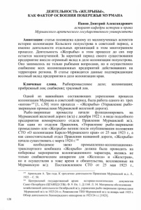 ДЕЯТЕЛЬНОСТЬ «ЖЕЛРЫБЫ», КАК ФАКТОР ОСВОЕНИЯ ПОБЕРЕЖЬЯ МУРМАНА Панов Дмитрий Александрович аспирант кафедры истории и права Мурманского арктического государственного университета Аннотация: статья посвящена одному из малоизученных аспектов истории колонизации Кольского полуострова в советский период, а именно деятельности отдельных организаций в этом многогранном процессе. Деятельность «Желрыбы» в этом процессе до сих пор остается малоизученной. За короткий период своего существования предприятие внесло огромный вклад в дело колонизации полуострова. Оно занималось не только рыбными вопросами, но и осуществляло снабжение всех колонизационных предприятий действовавших на территории региона. В статье приводятся данные подтверждающие весомый вклад предприятия в дело колонизации края. Ключевые слова. Рыбопромысловое дело; колонизация; прибрежный лов; снабжение; траловый лов. Одной из важнейших составляющих укрепления процесса колонизации Мурмана в советский период, была работа одного из трех «китов»159 [1, с.50] этого процесса - «Желрыбы» (Управление рыбо звериными промыслами Мурманской железной дороги). Рыбо-зверинные промыслы начали функционировать на Мурманской железной дороге (ж/д) с декабря 1922 г. в виде подсобного предприятия коммерческого отдела Правления Мурманской ж/д. Как один из отделов Правления, «Управление рыбо-звериными промыслами» или «Желрыба» возник после опубликования положения СТО «О колонизации Карело-Мурманского края» от 25 мая 1923 г., а как самостоятельный отдел Правления названной дороги, «Желрыба» начала существовать с марта 1924 г.160 Как необходимое звено промышленно-колонизационно транспортного комбината «Желрыба» должна была проводить на побережье мероприятия колонизационного характера, являясь не только снабженческим аппаратом для «Желлеса» и «Желстроя», но и осуществляя в тоже время и обязательства, возложенные на Мурманскую ж/д Постановлением СТО от 25 мая 1923 г., 159 Арнольдов А. Три года. К трехлетию деятельности Правления Мурманской ж.д. Л., 1925 .- С . 50. 160 Центральный государственный архив историко-политических документов Санкт-Петербурга (ЦГАИПД СПБ). Ф. 9. On. 1. Д. 1168. Л. 34. Материалы обследования хозяйственной деятельности Октябрьской ж/д, управления рыбо-звериными промыслами Мурманской ж/д за 1923Y24 г.г, Ревкомиссии ТПО Мурманской ж /д за январь-май 1925 г. Обзор деятельности Ленинградского ипподрома за 1923/24 г.г. [1925]. 120
