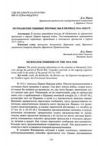 УДК 639.2:94(470.21)«1914/1920» ББК 63.3(2Рос-4Мур)534-2 Д .А . Панов Мурманский арктический государственный университет г. Мурманск, Россия МУРМАНСКИЕ РЫБНЫЕ ПРОМЫСЛЫ В ПЕРИОД 1914-1920 ГГ. Аннотация. В статье приводятся данные об обстановке на мурманских промыслах в период Первой мировой войны. Рассматриваются мероприятия организационного характера, проводимые в отношении промыслов в период 1917-1920 гг. Ключевые слова: промыслы, большевики, Баренцево море, Верховное управление Северной области, Временное Правительство. D.A. Panov Murmansk Arctic State University Murmansk, Russia MURMANSK FISHERIES IN THE 1914-1920 Abstract. The article presents information on the situation at Murmansk I fish ­ eries during the period o f World War. Considers activities in the ongoing organiza­ tional crafts in the nature o f the period 1917 to 1920. Key words: crafts, the Bolsheviks, the Barents sea, the Supreme management o f the Northern region, the Provisional Government. В 1914 г. началась Первая Мировая война. Многие промышленники и скупщики были призваны в армию. Сам факт начала войны, скорее всего, не оказал бы влияние на промыслы, но, как часто бывает, панические слу­ хи сделали свое дело. Решающий, но не смертельный, удар по промыслам нанес слух о приближении к Мурману немецкой эскадры [4, л. 65-65 об.], вследствие чего на Мурмане, а затем и в Архангельске началась паника. Временно прекратилось пароходное сообщение, часть промысловиков по­ пыталась самостоятельно покинуть место промыслов. Видимо, это проис­ ходило неорганизованно, в спешке, панической обстановке, т.к. погибло до 25 чел. [4, л. 65-65 об.]. Оставшиеся промышленники оказались в затруд­ нительном положении: прекратились подвоз продовольствия из Архан­ гельска, вывоз продуктов промысла и их скупка на месте; местные факто- ристы отказывались покупать продукцию промыслов и отпускать продук­ ты питания в кредит. Как только пароходное сообщение восстановилось, большая часть промышленников отправилась домой. Лов продолжили ко­ лонисты и часть оставшихся поморов-промышленников. В соседнем Финмаркене ситуация в корне отличалась, норвежские рыбопромышленники спокойно продолжали лов. Однако находившиеся 118