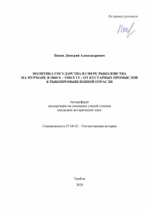 Панов, Д. А. Политика государства в сфере рыболовства на Мурмане в 1860-х - 1920-х гг.: от кустарных промыслов к рыбопромышленной отрасли : специальность 07.00.02 - Отечественная история : автореферат диссертации на соискание ученой степени кандидата исторических наук / Панов Дмитрий Александрович ; научный руководитель: кандидат исторических наук, доцент Бардилева Юлия Петровна ; [место защиты: Тамбовский государственный университет имени Г. Р. Державина]. – Тамбов, 2020. – 26 с.