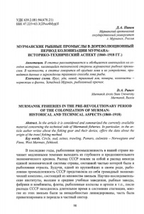 УДК 639.2.081:94(470.21) ББК 47.225+63.3(2Рос4Мур)5 Д .А . Панов Мурманский арктический государственный университет г. Мурманск, Россия МУРМАНСКИЕ РЫБНЫЕ ПРОМЫСЛЫ В ДОРЕВОЛЮЦИОННЫЙ ПЕРИОД КОЛОНИЗАЦИИ МУРМАНА: ИСТОРИКО-ТЕХНИЧЕСКИЙ АСПЕКТ (1860-1918 ГГ.) Аннотация. В статье рассматривается и обобщается имеющийся на се годня материал, касающийся технической стороны мурманских рыбных промы слов. В частности, в статье говорится об орудиях лова и их устройстве, при водятся данные о зарождении тралового способа лова рыбы. Ключевые слова. Ярус, уда, невод, траловый лов, поморы, колонисты - норвежцы и финны, Западный Мурман, рыболовный крючок. D.A. Panov Murmansk Arctic State University Murmansk, Russia MURMANSK FISHERIES IN THE PRE-REVOLUTIONARY PERIOD OF THE COLONIZATION OF MURMAN: HISTORICAL AND TECHNICAL ASPECTS (1860-1918) Abstract. In the article it is considered and summarized the currently available material concerning the technical side o f Murmansk fisheries. In particular, in the ar ticle author writes about the fishing gear and their device, offers the data about the origin o f the trawlfishing method. Key words. Circle, oud, seines, trawling, Pomors, colonists - Norwegians and Finns, West Murman, fishhook. В последние годы, рыболовная промышленность в нашей стране на чинает медленными темпами выходить из глубокого и продолжительного экономического кризиса. Распад СССР повлек за собой и распад некогда единой экономической системы страны, составной частью которой была и рыболовная отрасль. Будучи, одной из крупнейших в своем роде, рыбо ловная промышленность СССР представляла из себя громадный экономи ческий комплекс, состоящий из множества звеньев. Научно-исследователь- ские институты, высшие и средние учебные заведения, рыбные заводы, фабрики и комбинаты, флоты, рыболовные колхозы и артели и т.п., после распада СССР находились длительное время в состоянии стагнации, мно гие из этих звеньев были за ненадобностью ликвидированы, часть была приватизирована и перешла в частный сектор. 98