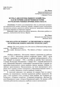 УДК 070 (091) ББК 76.003 Д.А. Панов Мурманский арктический государственный университет г. Мурманск, Россия ЖУРНАЛ «БЮЛЛЕТЕНЬ РЫБНОГО ХОЗЯЙСТВА» КАК ИСТОЧНИК ДЛЯ ИЗУЧЕНИЯ ИСТОРИИ МУРМАНСКИХ РЫБНЫХ ПРОМЫСЛОВ В 1920-Е ГГ. Аннотация. В статье рассматривается один из источников централь ной периодической печати советского периода, который можно использовать для изучения истории мурманских рыбных промыслов; приводится статистика упоминания Мурмана на страницах журнала. Ключевые слова: мурманские рыбные промыслы, «Бюллетень рыбного хо зяйства», статистические данные, Мурман. D.A. Panov Murmansk Arctic State University Murmansk, Russia “THE BULLETIN OF FISHERY” AS THE HISTORICAL SOURCE OF MURMANSK FISHING INDUSTRY STUDYING (1920th) Abstract. This article analyzes one o f the sources o f Murmansk fishing industry studying - “The Bulletin o f Fishery ”. Key words: Murmansk fisheries, “The Bulletin o f Fishery”, statistical data, Murman. «Рыбное хозяйство», «Бюллетень главного управления по рыболов ству», а с 1924 г. «Бюллетень рыбного хозяйства» (далее - БРХ) - орган Главного управления по рыболовству и рыбной промышленности в Рос сии. Первый год издания - 1920, с сентября по декабрь было выпущено 4 номера. Вследствие объединения с 1 января 1921 г. изданий деятельности всех учреждений Народного комиссариата продовольствия в ведении ре- дакционно-издательского отдела комитета, выпуск журнала «Рыбное хо зяйство» приостановился. Предполагалось, что часть программного мате риала этого издания должна помещаться в «Продовольственной газете», а другие - в особых сборниках статей по рыбному хозяйству. В советской периодике того времени это издание было не единст венным, где затрагивалась тематика мурманских рыбных промыслов. На ряду с этим изданием стоит упомянуть такие издания, как «Северное ры боловство», «Северное хозяйство», «Северный кооператор», «Вестник Ка рело-Мурманского края» («Карело-Мурманский край»). Но именно в БРХ тематика рыболовства освещалась наиболее полно и систематично. 179