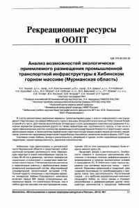 РЕКРЕАЦИОННЫЕ РЕСУРСЫ и ООПТ Рекреационные ресурсы и ООПТ УДК 379.85:502.36 Анализ возможностей экологически приемлемого размещения промышленной транспортной инфраструктуры вХибинском горном массиве (Мурманская область) А.А. Тишков', д.т.н., проф., Н.А. Константинова2, д.б.н., проф., Е.А. Шварц5, д.т.н., К.Н Кобяков5, Н.Е. Королёва2, к.б.н., В.Н. Петров4, Н.А. Соболев’, к.т.н., М.А. Викулина6, к.г.н., /1.Г. Исаева3. к.с.-х.н., С.В. Титова1, В.А. Костина2, О.В. Петрова34, С.К. Коняев6, Е.П. Гурина7 ' Институтгеографии РАН 2Полярно-альпийский ботанический сад-институтим. Н.А. Аврорина (ПАБСИ) КНЦ РАН 3Институтпроблем промышленной экологии Севера (ИППЭС) КНЦ РАН 4Кольский центр охраны дикой природы 5Всемирный фонд дикой природы ( WWFРоссии) 6Хибинская учебно-научная база географического факультета МГУ им. М. В. Ломоносова 7ЗАО «Росинжиниринг» В статье рассмотрены различные варианты транспортировки руды с апатит-нефелинового месторож­ дения «Партомчорр» на севере Хибинского горного массива (Кольский полуостров) до ГОКа «Олений Ручей» в южной его части. Для поиска экологически оптимального пути произведено комплексное сравнение 4 ос­ новных вариантов промышленной дороги по таким параметрам как: протяженность трассы, в том числе и через лавиноопасные участки; количество выявленных в непосредственной близости от дороги мест нахож­ дения редких видов, а также наличие пересечения с местами концентрации редких видов растений и лишай­ ников; количество нарушаемых водотоков и водосборных бассейнов; изменение индекса формы ООПТ и др. Ключевые слова: Хибины, флора и растительность, рекреация и туризм, особо охраняемые природные территории, горная промышленность, дорожное строительство. Хибинские горы расположены в центральной части Мурманской области и представляют собой щелочную интрузию центрального типа, образую­ щую округлую в плане платообразную горную си­ стему 30-45 км в диаметре, частично перекрытую миренными отложениями и продуктами выветри- яяния трмых пород. Слагающие массив щелочные и нефелиновые сиениты с карбонатитами имеют уникальный минеральный состав, обусловленный специфической геологической историей [1=3]. Полный кадастр описанных к настоящему време­ ни минералов Хибино-Ловозерского комплекса включает свыше 600 твердо установленных ми­ неральных видов, что значительно больше, чем в любом другом массиве или месторождении мира, причем 122 их этих минералов впервые были от­ крыты именно здесь [4]. Ландшафт, флора и растительность. Особен­ ности климата и зональное расположение обе­ спечили отчетливую поясную дифференциацию и формирование в Хибинах высокогорных условии и ландшафтов [5]. В Хибинских горэх хорошо вы­ ражены три основных высотных пояса - горно- лесной, березовых криволесий и тундровый, свое название получивших по преобладающему в пре­ делах пояса типу растительности. Растительный покров - это наиболее выразительный компонент ландшафта Хибин, он тесно связан и отражает разнообразие и дифференциацию других ланд­ шафтных компонентов и процессов. Хибинский Бюллетень «Использование и охрана природныхресурсов в России», 2013, №1 51