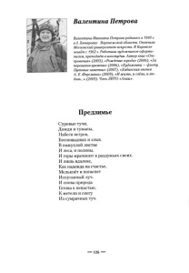 Валентина Петрова Валентина Ивановна Петрова родилась в 1940 г. в д. Гончаровке Воронежской области. Окончила Московский университет искусств. В Кировске живёт с 1962 /.. Работала художником-оформи- телем, преподаёт в изостудии. Автор книг « От кровения» (2003), «Рождение города» (2006), «За перевалом времени» (2006), *Художники — флоту. Путевые заметки» (2007), «Хибинская эпопея А. Е. Ферсмана» (2009), «Ижизнь, и слёзы, и лю бовь...» (2009). Член ЛИТО «Алаиі». Предзимье Суровые тучи, Дожди и туманы, Набеги ветров, Беспощадных и злых. В пожухлой листве И леса, и поляны, И горы мрачнеют в раздумьях своих. И лишь вдалеке, Как надежда на счастье, Мелькнёт и погаснет Испуганный луч. И снова природа Готова к ненастью, К метели и снегу Из сумрачных туч. — 126 —
