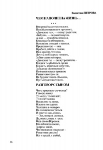 ВалентинаПЕТРОВА ЧЕМНАПОЛНЕНАЖИЗНЬ... * * * Вмире всё так относительно, Порой до смешного и грустного. «Девчонка ты «, — скажут родители, «Бабуля», — окликнет внучка. А я же — душа безмятежная, Без возраста и без границ. Всю жизнь молодая и нежная, Пред красотою —ниц. В работе, заботе и поиске, Ища красоту, что клад, Лечу за ней скорым поездом, Забыв суеты маскарад. «Девчонка ты, — скажут родители, - Когда ж ты уймёшься, скажи, Когда ты вернешься к обители, Забудешь свои миражи?». Повиснет вопрос туманом, Развеется ветром он. Не буду их тешить обманом, Пусть продолжается сон. РАЗГОВОРССЫНОМ Что с природою случилось? Говорю я сыну. То мороз, то снег идёт, То ползётлавина. Вроде лето на дворе, В зелень лес оделся. Холодина в «конуре», На солнце не согреться. И ответил сын, смеясь: — Зря, мамуля, стонешь. Да, мороз, снега и грязь, Ведь это не Воронеж. Кто тебя сюда сослал, За грехи какие, Что ты ищешь среди скал - Романтики стихию? Вот и кушай, и хлебай, 36