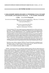 ЗАПИСКИ РОССИЙСКОГО МИНЕРАЛОГИЧЕСКОГО ОБЩЕСТВА 2024, Ч. CLIII, 4, с. 117–133 В 2024 г. исполняется 250 лет со времени первой находки в России кобальтовых руд— водного арсената кобальта, минерала эритрина Co 3 [AsO 4 ] 2 ·8H 2 O или как тогда говорили— «кобальтовых цветов». Обнаружил «кобальтовые цветы» весной 1774 г. в одной из жилМед- вежьеостровского серебряного рудника в Русской Лапландии бергмастер Берг-коллегии, будущий преподаватель химии, металлургии и минералогии Горного училища (с 26 июня (7 июля) 1774 г.) и будущий член-корреспондент Петербургской академии наук (с 12 (23) октября 1779 г.) АлександрМатвеевич Карамышев (1744—1791). До этого времени на тер- ритории Российской империи минералы кобальта не были известны. Данная статья посвя- щена истории организации и проведению «учeной поисковой экспедиции» Берг-коллегии, проходившей под руководствомА.М. Карамышева с октября 1773 по июнь 1774 г., к местам бывшей разработки серебряных руд на Медвежьем острове и Кандалакшском берегу Бе- лого моря. Во время этой экспедиции и была впервые в России открыта кобальтовая ми- нерализация. Статья написана по имеющимся опубликованным и архивным источникам. К сожалению, к настоящему времени сохранилось очень мало материалов, относящихся к этой экспедиции, но в общих чертах историю, как событий предшествующих экспедиции и вызвавших интерес Берг-коллегии к возрождению добычи серебра в Русской Лапландии, так и событий, связанных с ее организацией и проведением, восстановить можно. DOI: 10.31857/S0869605524040086, EDN: PCUQHQ Ключевые слова : кобальт, эритрин, XVIII век, Русская Лапландия, серебряные руды, Медвежий остров, мыс Ройменский наволок, Берг-коллегия, Филипп Полежаев, А.Э. Мусин-Пушкин, М.Ф. Соймонов, А.М. Карамышев Статья посвящена 250-летию первой находки на территории России кобальтовой мине- рализации—минерала эритрина (Co 3 [AsO 4 ] 2 ·8H 2 O). Находка была сделана бергмастером Берг-коллегии А.М. Карамышевым в 1774 г. в серебряно-рудной жиле Ройменского наволока, во время учeной поисково-разведочной экспедиции 1773—1774 гг., орга- низованной Берг-коллегией в Русскую Лапландию. В статье, на основании архивных и опубликованных источников, прослежены события побудившие Берг-коллегию к по- пытке возрождения добычи серебра на Медвежьем острове и Кандалакшском берегу Русской Лапландии. Реконструирована история организации и проведения в 1773— 1774 гг. учeной поисково-разведочной экспедиции Берг-коллегии к местам добычи серебра в Русской Лапландии во времена правления Анны Иоанновны. Показано, что А.М. Карамышев является первооткрывателем кобальтовой минерализации в России. Поступила в редакцию 26.02.2024 г. После доработки 22.04.2024 г. Принята к публикации 17.06.2024 г. Геологический институт ФИЦ, Кольский научный центр РАН, ул. Ферсмана, 14, Апатиты, Мурманская область, 184209 Россия e-mail: petrovsk2@rambler.ru © 2024 г. Д. чл. М. Н. Петровский О КОБАЛЬТОВОЙ МИНЕРАЛИЗАЦИИ В СЕРЕБРЯНЫХ РУДАХ РУССКОЙ ЛАПЛАНДИИ (МУРМАНСКАЯ ОБЛАСТЬ) – К 250-ЛЕТИЮ ОТКРЫТИЯ ИСТОРИЯ НАУКИ
