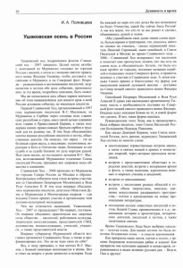 26 Духовность и время И. А. Поливцева Ушаковская осень в России Ушаковский под Андреевским флагом Славян­ ский ход — 2007 завершен. Целый месяц автобус с делегацией из Мурманска следовал по городам России с иконой, а затем и с мощами святого правед­ ного воина Феодора Ушакова, чтобы доставить эту святыню в Мурманск и на Северный флот. Впере­ ди —размышления и воспоминания писателей, жур­ налистов и поэтов обо всех событиях, произошед­ ших за это время, подробное описание, быть может. Мы же попытаемся дать общее первое впечатле­ ние об этом наиважнейшем для нашего края и всей России духовном событии, не имеющем аналогов. Первый Славянский Ход, организованный в 1997 году мурманским писателем В. С. Масловым, из Мурманска в Сербию через столицы всех славян­ ских республик и стран, имел своей целью единение всех славян и Православной Церкви, а также под­ держка наших православных братьев-сербов в труд­ ный для их родины час. В том Ходе объединились многие видные российские писатели и поэты, обще­ ственные деятели. Он показал, что народ — это не безликая серая масса, а мыслящие, талантливые, ве­ рующие в Бога и Отечество люди, болеющие за его судьбу и за судьбу близких по духу народов душой. Всю свою жизнь, до последнего дыхания В. С. Мас­ лов, возглавлявший Мурманское отделение Союза писателей России, призывал все здоровые силы об­ щества к единению. Славянский Ход —2006 проходил из Мурманска по городам Севера России до Москвы и обратно. Центральным событием хода стала встреча участни­ ков со Святейшим Патриархом Московским и Всея Руси Алексием II. В том ходе впервые объедини­ лись мурманские писатели, депутаты Областной Ду­ мы и Мурманская и Мончегорская епархия — сам владыка Симон принял участие в организации этой духовно-культурной экспедиции. Чем же отличается нынешний. Ушаковский, Ход —2007 от предыдущих? Во-первых, составом. Он впервые объединил практически все здоровые силы общества —писателей, работников культуры, творческую интеллигенцию, представителей СМИ, духовенства, военнослужащих, учителей, учащих­ ся., а также представителей власти. Впервые губернатор Мурманской области воз­ главил оргкомитет Славянского Хода, а также и про­ финансировал его. Это ли не чудо само по себе? Все, к чему призывал, о чем мечтал В. С. Мас­ лов, с Божьей помощью воплощается в жизнь. Вот и ответ на вопрос о роли личности в истории. Если бы каждый по мере его сил делал бы все возможное на благо Отечества, какой бы сейчас была Россия! А мы все ждем, что кто-то за нас решит и сделает, обленившись душой и телом. «Мы утрамбовали свои души таким слоем грун­ та, бульдозерами и тракторами, что, казалось, никто не сможет их откопать,—сказал мурманский писа­ тель Николай Скромный, ныне покойный, в Союзе Писателей в Москве во время Славянского хода — 2006.—Славянский Ход вспарывает эти наслоения и помогает нам проснуться, понять, кто мы есть на самом деле, и объединиться». Кстати, это была его идея пройти по городам, носящим названия кораб­ лей и подводных лодок Северного флота, и привлечь военных к участию в Славянском ходе. А затем вла­ дыка Симон принял и благословил эту форму для выполнения важной духовной миссии — доставки на Север мощей святого праведного воина Феодора Ушакова. Святейший Патриарх Московский и Всея Руси Алексий II давно уже высказывал архиепископу С