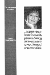 Поэтическая тетрадь Ирина а ПОЛИВЦЕВА ПОЛИВЦЕВА Ирина Ан дреевна. Родилась в Феодосии. Закончила Донецкий государ ственный университ ет по специальности организатор управленческого труда. На Кольской земле — с 1983 года. Работала в Центре со циального обслуживания на селения гор. Североморска. С 2002 года возглавляет Па ломническую службу Трифо нов Печенгского монастыря.
