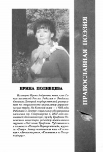 ИРИНА ПОЛИВЦЕВА Поливцева Ирина Андреевна, поэт, член Со юза писателей России. Родилась в Феодосии. ОкончилаДонецкий государственный универси тет по специальности организатор управлен ческого труда. На Кольской земле —с 1983 года. Работала в Центре социального обслуживания населения гор. Североморска. С 2002 года воз главляет Паломническую службу Трифонов Пе- ченгского монастыря, редактор православного журнала «Под сенью Трифона». Публиковалась в альманахе «Площадь Первоучителей», журна ле «Север». Автор поэтических книг «К исто кам », «Вечности река», «К святыням за Поляр ный круг». ПРАВОСЛАВНАЯ ПОЭЗИЯ