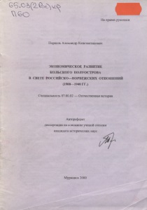 На правах рукописи Порцель Александр Константинович ЭКОНОМИЧЕСКОЕ РАЗВИТИЕ КОЛЬСКОГО ПОЛУОСТРОВА В СВЕТЕ РОССИЙСКО—НОРВЕЖСКИХ ОТНОШЕНИЙ (1900—1940 ГГ.) Специальность 07.00.02 — Отечественная история Автореферат диссертации на соискание ученой степени кандидата исторических наук Мурманск 2000