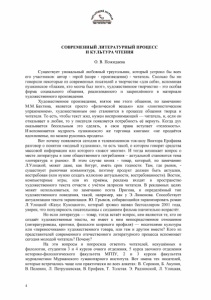 с о в р е м е н н ы й л и т е р а т у р н ы й п р о ц е с с И КУЛЬТУРА ЧТЕНИЯ О. В. Пожидаева Существует уникальный любовный треугольник, который устроил бы всех его участников: автор - герой (шире - произведение) - читатель. Сколько бы ни говорили некоторые из современных писателей о творчестве «для себя», вспоминая пушкинское «блажен, кто молча был поэт», художественное творчество - это особая форма социального общения, реализованного и закреплённого в материале художественного произведения. Художественное произведение, взятое вне этого общения, по замечанию М.М. Бахтина, является просто «физической вещью» или «лингвистическим упражнением», художественным оно становится в процессе общения творца и читателя. То есть, чтобы текст жил, нужен воспринимающий — читатель, и, если он отказывает в любви, то у писателя появляется потребность её вернуть. Когда дух оказывается бессильным это сделать, в свои права вступает «телесность». И вспоминается мудрость пушкинского же торговца книгами: «не продаётся вдохновенье, но можно рукопись продать». Вот почему появляется сегодня в телевизионном ток-шоу Виктора Ерофеева разговор о понятии «модный художник», то есть такой, о котором говорят средства массовой информации или которого «знают многие». И тогда возникает вопрос о месте литературы в зоне общественного потребления - актуальной становится тема «литература и рынок». В этом случае книга - товар, который, по замечанию Л.Улицкой, может даже, как йогурт, иметь срок годности. Там, где рынок, - существует рыночная конъюнктура, поэтому продукт должен быть актуален, востребован (или нужно создать иллюзию актуальности, востребованности). Восток, компьютерные игры, или их приёмы, реклама входят в пространство художественного текста отчасти с учётом запросов читателя. В рекламных целях может использоваться, по замечанию поэта Пригова, и определённый тип художественного поведения, такой, например, как у Э. Лимонова. Способствует актуализации текста экранизация. Ю. Грымов, собирающийся экранизировать роман Л. Улицкой «Казус Кукоцкого», который громко назван бестселлером 2001 года, уверен, что популярность писательницы с созданием фильма значительно возрастёт. Но если литература — товар, тогда встаёт вопрос, кем являются те, кто не создаёт художественные тексты, но имеет к ним непосредственное отношение (литературоведы, критики, филологи широкого профиля) — носителями культуры или «переносчиками» художественного товара, или тем и другим вместе? Кого из представителей современного отечественного литературного процесса вспоминает сегодня молодой читатель? Почему? На эти вопросы я попросила ответить читателей, искушённых в филологии, студентов 3 и 4 курсов очного отделения, 5 курса заочного отделения историко-филологического факультета МГПУ, 2 и 3 курсов факультета журналистики Мурманского гуманитарного института. Вот имена тех писателей, которые встречались чаще или практически во всех анкетах: В. Сорокин, Б. Акунин, В. Пелевин, Л. Петрушевская, В. Ерофеев, Т. Толстая. Э. Радзинский, Л. Улицкая,