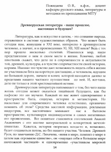 Пожидаева О. В., к.ф.н., доцент кафедры русского языка, литературы и методики их преподавания МГГУ Древнерусская литература - наше прошлое, настоящее и будущее? Литература, как и искусство в целом, - это сознание народа, отраженное в системе художественных образов. Что может быть сегодня нам, живущим в XXI веке, интересно в древнерусском человеке, а значит, и в произведениях XI, XII, XIII веков? Ведь с тех пор прошло несколько столетий. Изменился мир, наше представление о нем и своем месте в жизни. Конечно, любой школьник скажет, что дело не в современности и актуальности той, древней, культуры, а в чувстве сопричастности своей истории, корням. Именно это чувство дает возможность видеть себя в жизни не участником бега на короткую дистанцию, а человеком, идущим по большой дороге, начало и конец которой находятся далеко за пределами нашего частного путешествия по ней. И, все-таки, дело не только в этой хрестоматийной истине. Древнерусская литература напоминает о том, без чего наша жизнь сегодня может оказаться лишённой будущего, как бы пафосно это ни звучапо. Каждый из нас живет одновременно в пространстве быта, социума, истории и метаистории. Но насколько дня современного человека естественно, органично помнить об этом? Средства массовой информации, рекламная индустрия, все настойчивее замыкают нас в бытовом пространстве, культивируя инди видуализм в самых негативных его проявлениях. Все понятнее становится гоголевский Акакий Акакиевич с его вполне материальной и конкретной мечтой- шинелью. Кажется, история творилась когда-то и, возможно, будет создаваться потом, но без нашего участия. Человек Древней Руси, по замечанию Д.С. Лихачева, «живя в мире, помнил о мире в целом как огромном единстве», он «ощущал себя в большом мире ничтожной частицей» и одновременно «участником мировой 14