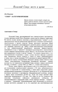 Кольский Север: место и время И.А.Разумова "СЕВЕР" - КАТЕГОРИЯ ВРЕМЕНИ Времен столько, сколько вещей; а вещей, или, вернее, родов их столько, сколько смыслов и идей. Время - боль истории, непонятная "научным" исчислениям времени. А.Ф.Лосев Адаптация к Северу Кольский Север, рассматриваемый как социокультурное пространство, по ряду признаков может быть объединен с рядом других северных территорий. Во многом сходны процессы заселения и индустриализации "северов" за счет принудительных мер или привлечения рабочей силы с помощью экономических, идеологических и прочих стимулов. Можно проследить некоторые общие тенденции, касающиеся демографического развития разных северных регионов (см., например, [Артюхов и др., 1999]), а также межэтнических коммуникаций, то есть взаимоотношений аборигенного населения (финно-угорского, самодийского и пр.) и "пришлого" смешанного русскоязычного. Типологически сходны северные промышленные города. Вместе с тем Кольский Север имеет и ярко выраженные отличия от прочих "северов". Это связано, прежде всего, с его геополитическим положением, а также с ролью научного фактора в развитии края. Мурманская область является и одной из самых урбанизированных в стране, здесь в городах проживает 93,5% населения (по данным переписи 2002 г.). При этом все города, за исключением областного центра, можно отнести к типу "малых" индустриальных. Подавляющее большинство населения - прямые потомки тех, кто переселялся на Крайний Север, начиная с первых десятилетий XX века, и особенно - с конца 1920-х до 1980-х гг., а также сами мигранты. Регион, таким образом, представляется едва ли не идеальным объектом для исследования социокультурной динамики в XX веке, урбанизационного "скачка" и технологий его осуществления, а также форм осмысления данных преобразований индивидами и группами. Несмотря на то, что Мурманский край постепенно включался в пространство общенациональной культуры, начиная с первых веков колонизации (ХІ-ХІІ вв.), более или менее цельный образ территории сформировался в XX веке. Этот образ не мог бы сложиться при отсутствии относительно стабильного регионального сообщества, его самоидентификации и определения извне: в более широком значении - "северяне", в суженном - "мурманчане". Функционирование таких обозначений, их достаточно высокая частотность указывают на то, что существует ряд идентифицирующих 5