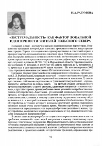 И.А. РАЗУМОВА I; I ___________ «ЭКСТРЕМАЛЬНОСТЬ» КАК ФАКТОР ЛОКАЛЬНОЙ ИДЕНТИЧНОСТИ ЖИТЕЛЕЙ КОЛЬСКОГО СЕВЕРА Кольский Север - достаточно цельно воспринимаемая территория, боль шинство населения которой, как известно, проживает в малых индустриаль ных городах. Города эти создавались преимущественно в советский период в процессе научно-промышленного освоения края. Урбанизация осуществля лась быстрыми темпами и почти исключительно за счет мигрантов, что в свое время определило и продолжает определять демографическую и этнокультур ную ситуацию в регионе. В 1959 году в Мурманской области городское населе ние составило 51 процент. К 1989 году эта цифра выросла до 92 процентов, в то время как в селе проживали 99 тысяч человек1. По итогам переписи 2002 года, городское население составило 824 тысячи человек, сельское - 69 тыс.2 Согласно теории трехстадийности миграционного процесса, предложен ной JI. JI. Рыбаковским, миграция включает 1) подготовительную стадию, или процесс формирования территориальной подвижности населения, 2) основ ную стадию - собственно переселение, и 3) заключительную стадию - «прижи ваемость» мигрантов на новом месте. На третьей стадии миграционного процесса происходит, с одной стороны, адаптация мигрантов к новым усло виям, с другой стороны, приспособление самих условий к потребностям миг рантов (обустройство). Адаптация - это сложный социально-биологический процесс, который связан с приспособлением мигрантов к новым природно- климатическим условиям, к новому социальному окружению, к новому обра зу жизни и т.д., и который далеко не всегда протекает безболезненно. Период обустройства, в течение которого новоселы достигают уровня старожилов, занимает порой очень значительное время. Многие проблемы, с которыми сталкиваются переселенцы в этот период (обретение достойного жилья, тру доустройство, конфликты с коренным населением и т.п.), становятся источни ками социальной напряженности1. В связи с этим важна разработка социально-антропологических аспектов проблемы, связанной с адаптацией мигрантов к новому социальному, куль турному, этническому окружению. Привлекательность либо отталкивающий потенциал территорий выбытия и прибытия в значительной мере зависят от межличностных взаимоотношений, наличия сообществ мигрантов-земляков, родственных и дружеских связей, исторических традиций, отражающих пре- 91