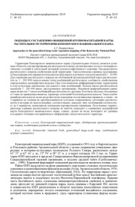 Геоботаническое картографирование 2018 С. 40-65. Vegetation mapping 2018 P. 40-65. А.В. РАЗУМОВСКАЯ ПОДХОДЫ К СОСТАВЛЕНИЮ ОБОБЩЕННОЙ КРУПНОМАСШТАБНОЙ КАРТЫ РАСТИТЕЛЬНОСТИ ТЕРРИТОРИИ КЕНОЗЕРСКОГО НАЦИОНАЛЬНОГО ПАРКА А. V. Razumovskaya Approaches to the generalized large-scale vegetation mapping of the Kenozersky National Park Институт проблем промышленной экологии Севера КНЦ РАН 184209 Мурманская обл., г. Апатиты, Академический городок, 14а; аппа-1упх(й>таі1.т Территория Кенозерского национального парка (Архангельская область) является слож ным объектом для картирования растительности в связи с разнообразием геолого-геоморфоло- гических условий и длительной историей сельскохозяйственного освоения. Неоднородность растительного покрова свойственна всей территории. Типологические единицы (ассоциации, субассоциации и их варианты) показаны на пяти картах ключевых участков масштаба 1 : 10 000. Для отражения растительного покрова на обобщенной крупномасштабной карте растительно сти (м. 1 : 200 000) использованы типы комбинаций растительных сообществ, свойственные определенным ландшафтным выделам. При этом выявлены дифференцирующие, характерные и сопутствующие синтаксоны для каждого типа комбинаций. Легенда карты растительности масштаба 1 : 200 000 имеет двухуровневую организацию. Высшими иерархическими едини цами являются 7 типов комбинаций растительности; крупные болотные системы объединены в 2 типа по преимущественному характеру сочетаний болотной растительности. Типы комби наций растительности далее разделяются на плакорные и аллювиальные варианты, а также - на 3 варианта по степени их преобразованности (согласно современному состоянию раститель ности и истории их использования); соответственно, каждому типу комбинаций соответству ет до 6 вариантов, являющихся основными картируемыми единицами. Полученные террито риальные единицы растительного покрова во многом совпадают с единицами ландшафтной карты Кенозерского национального парка, однако, далеко не везде повторяют их границы и содержат ботанико-географическую информацию самостоятельного характера. К л ю ч е в ы е с л о в а : Кенозерский национальный парк , обобщенная крупномасштаб ная карта , комбинации растительных сообществ. K e y wo r d s : Kenozersky National Park , generalized large-scale map, combinations o fp la n t communities. Кенозерский национальный парк (КНП), созданный в 1991 году в Каргопольском и Плесецком районах Архангельской области с целью сохранения уникальных при родных и историко-культурных комплексов Русского Севера, расположен между 61° 37' и 62° 16' с. ш., 37° 50' и 38° 33' в. д. и имеет площадь 141.3 тыс. га. Терри тория КНП находится в пределах Северодвинско-Верхнеднепровской подпровинции Североевропейской таежной провинции, в подзоне средней тайги (Геоботаничес кое..., 1989). Коренной формацией зональной растительности являются еловые леса. Район КНП выделяется на фоне равнинного окружения сложным геологическим строением и разнообразными формами рельефа (Атлас Архангельской области, 1976; Геологическая карта четвертичных образований, 2016). По территории парка с юго- запада на северо-восток проходит геологический рубеж между Балтийским кристал лическим щитом и осадочным чехлом Восточно-Европейской платформы. Краевая часть Балтийского щита, сложенная нижнепротерозойскими гнейсами и гранитои- дами, проходит по западной стороне парка, вдоль границы с Карелией. Юг, восток и сев