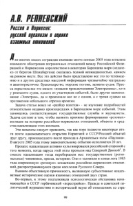 Й.В. РЕВНЕВСКНИ Россия о Норвегия: руссвои идеализм в оценке взаимных отношений “ ля многих наших сограждан имевшая место осенью 2005 года вспышка взаимного обострения пограничных отношений между Российской Феде­ рацией и Норвежским королевством в акватории Баренцева моря (недале­ ко от берегов Шпицбергена) оказалась полной неожиданностью, камнем на ровном месте. Все это действо было представлено все это по телевиде­ нию и в других средствах массовой информации чрезвычайно театрально и авантюристично: браконьерство, морские погони, захваты судов. Прес­ са окрестила все это вместе «новыми приключениями Электроника», хотя у реального судна, одного из участников событий, было другое наимено­ вание «Электрон», да и произошло все не с одним, а с тремя судами на протяжении небольшого отрезка времени. Задача статьи вовсе не «разбор полетов» - не изучение подробностей относительно недавно произошедших в Баренцевом море событий. Этим занимались соответствующие государственные службы и журналисты. Задача состоит в том, чтобы выявить причины формирования «розовых» взглядов на историю российско-норвежских отношений, объекты и сред­ ства идеализации этих взглядов. Эти моменты следует прояснить, так как пора подвести некоторые ито­ ги почти одномоментного открытия Норвегией и СССР/Россией объятий друг другу, произошедшего после прихода в Архангельск яхты «Паулина». В августе 2005 года этому знаменательному событию исполняется 20 лет. Процесс идеализации активно культивировался российской стороной с того момента, когда паруса этой яхты пропыли над Северной Двиной1. В смысле идеализации тогда переборщили все: государственные (регио­ нальные) чиновники, пресса, историки. Они и заложили в конце лета 1985 года современную «розовую» концепцию российско-норвежских отноше­ ний, распространившуюся среди населения Русского Севера. Выявим объективную причинность, вызвавшую субъективные неадек­ ватные исторические оценки взаимных отношений двух стран. Во-первых, к этому подталкивала психологическая обстановка начи­ нающейся в СССР горбачевской «персе гройки». Прежде в советской по­ литической журналистике и исторической науке об отношениях со стра­ 99