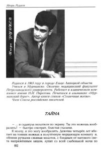 Игорь Руднев Родился в 1965 году в городе Ельце Липецкой области. Учился в Мурманске. Окончил медицинский факультет Петрозаводского университета. Работает в клиническом ком плексе имени Н.И. Пирогова. Печатался в альманахе «Мур манский берег». Автор книги стихов «Солнечнаяжатва». Член Союза российских писателей. ТАЙНА — ... и саданула молотком по экрану. Ты это можешь воо разить? — быстро смотрит, блистая глазами. Я молчу, я это могу вообразить. Девочка четырёх лет вбе гает на тонких ножках в полутёмную мерцающую комнату и, обеими ручками сжимая молоток, с бледным от матового све та напряжённым лицом, лупит со всей слабенькой мочи по 102