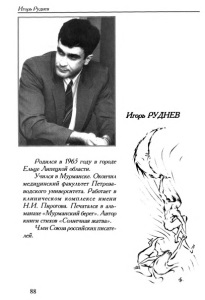 Игорь Руднев Родился в 1965 году в городе Ельце Липецкой области. Учился в Мурманске. Окончил медицинский факультет Петроза водского университета. Работает в клиническом комплексе имени Н .И . Пирогова. Печатался в аль манахе «Мурманский берег». Автор книги стихов «Солнечная жатва». Член Союзароссийскихписате лей. Игорь РУДНЕВ 88
