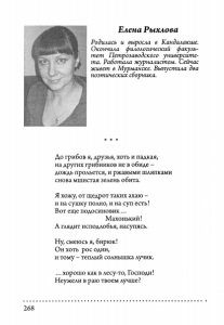 Елена Ры хло ва Родилась и выросла в Кандалакше. Окончила филологический факуль тет Петрозаводского университе та. Работала журналистом. Сейчас живет в Мурманске. Выпустила два поэтических сборника. * * * До грибов я, друзья, хоть и падкая, на других грибников не в обиде - дождь прольется, и ржавыми шляпками снова мшистая зелень обита. Я хожу, от щедрот таких ахаю - и на сушку полно, и на суп есть! Вот еще подосиновик... Махонький! А глядит исподлобья, насупясь. Ну, смеюсь я, бирюк! Он хоть рос один, и тому - теплый солнышка лучик. ... хорошо как в лесу-то, Господи! Неужели в раю твоем лучше? 268