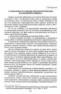 Г.М. Ржевская СТАНОВЛЕНИЕ И РАЗВИТИЕ МЕТЕОРОЛОГИЧЕСКИХ НАБЛЮДЕНИЙ В ХИБИНАХ Первые постоянные наблюдения за погодой на Кольском полуостро ве начались в 1843 г. на Орловском маяке, затем их продолжили станции на Сосновском (1862 г.) и Святоносском (1863 г.) маяках. Пионером в этом деле стал Департамент гидрографических работ морского ведомства. Во внутренних районах полуострова метеостанции появились только в 1899 г. (Лавозеро) и в 1900 г. (Хибины)1. За 110 лет в Хибинах и на прилегающей территории действовали 20 метеостанций различного типа. По плотности их размещения на огра ниченной территории этот факт является исключительным для России и связан с двумя обстоятельствами. 1. Интенсивным хозяйственным освоением Хибин с 1930 г. 2. Горным рельефом местности, где производились и производятся горные работы по добыче и переработке апатитовой и нефелиновой руды. К характерным особенностям хибинских метеостанций относится их привязанность к практическим запросам геологоразведчиков, железнодо рожников, горняков, летчиков, и только одна станция некоторое время ра ботала с чисто научными целями. Другой особенностью является их перенос на новое место, причем порой на десятки километров, что, безусловно, искажало ряды климатиче ских данных. Если, например, перенос станции Хибины на 23 км к югу от ее первоначального положения практически не сказался на ее данных, так как при этом не изменился характер рельефа: берег озера Имандра у под ножья Хибин и на той же абсолютной высоте. А перенос станции Цен тральная с плато Расвумчорр на плато Ловчорр на 3 км не только сущест венно изменил рельеф местности, но и привел к увеличению абсолютной высоты на 40 м, что заставляет считать эти станции отдельными, с незави симым рядом наблюдений. Характерными для большинства станций являются перерывы в на блюдениях, связанные с первой и второй мировыми войнами, производст венными циклами горнообогатительных предприятий, трудностями кри зисного периода 1990-х гг. Типичные метеорологические наблюдения на ряде ведомственных станций треста «Апатит» (ныне ОАО «Апатит») дополнялись метелемер ными измерениями, обследованием сошедших лавин, изучением строения снежной толщи, специальными исследованиями отложений изморози и го 1Тихомиров И.К. Общая характеристика климата Кольского полуострова и дальнейшие задачи исследований климата в этом районе. - М.; Л., 1940. - С. 8-18. 156