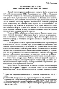 Г.М. Ржевская ИСТОРИЧЕСКИЕ ЭТАПЫ ГЕОГРАФИЧЕСКОГО ОТКРЫТИЯ ХИБИН Первый этап истории географического открытия Хибин начинается в XVI в. После основания в 1532 г. Кандалакшского, а в 1582 г. - Кольского монастырей1 между ними установился, так называемый, Кольский почто вый тракт. Часть пути пролегала по акватории оз. Имандра и не заметить горный массив, окаймлявший его восточный берег, было никак нельзя. В 1627 г. в «Книге большому чертежу» Хибины носят название Будринские горы, по-видимому, по названию травы «будра» или «кошачья мята»2. Но больше нигде это название не встречается, а на картах закрепилось саам ское «Хибины». Как ни странно, но в течение 300 лет по тракту проходили сотни монахов, рыбаков, купцов, охотников, служивых людей и никто из них не пытался проникнуть вглубь этих гор. Только в 1834 г. в Хибинах побывал капитан Корпуса горных инже неров Николай Васильевич Широкшин. Будучи геологом по специально сти, он обследовал северные и западные берега Белого моря и дошел по почтовому тракту до Имандры, где провел работы по изучению западных склонов Хибин3. К его заслугам относятся: первое определение горной породы нефели нового сиенита, которой сложены горы, установление следов древнего оле денения, определение высоты гор в 1 060 м над уровнем моря, что не силь но отличается от их истинной высоты и наконец, указание на существование «вечных снегов» на их вершинах. Здесь возможны два варианта их толкова ния: или в те годы развитие «малого ледникового периода» действительно привело к образованию нетающего в течение лета снега, или же Широк шин принял за него рано покрывший горы сентябрьский снежный покров. Всего через четыре года в Хибинах побывал будущий академик и выдающийся географ Александр Федорович Миддендорф. Он собрал кол лекцию хибинских горных пород, подтвердив мнение Широкшина о пре обладающей роли нефелиновых сиенитов. Затем, только полвека спустя, в Хибинах побывал молодой географ Николай Васильевич Кудрявцев, посланный сюда Русским географиче ским обществом4. Вслед за Широкшиным, он отмечает явные следы древ 1 Ушаков И.Ф. Избранные произведения: в 3 т. Мурманск: Мурман. кн. изд., 1997. Т. 1. 648 с. 2 Кошечкин Б.И. Тундра хранит след. Мурманск: Мурман. кн. изд., 1979.152 с. Широкшин Н.В. Геогностический обзор берегов Кандалакшской губы и Белого моря до г.КемивАрхангельскойгубернии//Горный журнал.СПб., 1835. 4.1. Кн.З. С. 397-427. Кудрявцев Н.В. Русская Лапландия // Журнал Министерства народного просвещения. 1884. №3-4. С. 5-18. 157