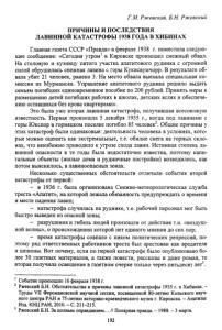 Г.М. Ржевская, Б.Н. Ржевский ПРИЧИНЫ И ПОСЛЕДСТВИЯ ЛАВИННОЙ КАТАСТРОФЫ 1938 ГОДА В ХИБИНАХ Главная газета СССР «Правда» в феврале 1938 г. поместила следую­ щее сообщение: «Сегодня утром1 в Кировске произошел снежный обвал. На столовую и кузницу пятого участка апатитового рудника с огромной силой обрушилась снежная лавина с горы Кукисвумчорр. В результате об­ вала убит 21 человек, ранено 3. На место обвала выехала специальная ко­ миссия из Мурманска. Управление апатитового рудника решило выдать семьям погибших единовременное пособие по 200 рублей. Принять меры к размещению детей погибших рабочих в школах, детских яслях и обеспече­ нию оставшихся без крова квартирами». Это была уже вторая лавинная катастрофа, получившая всесоюзную известность. Первая произошла 5 декабря 1935 г., когда под лавинами с горы Юкспор в горняцком поселке погибло 85 человек2. Общие причины у этих катастроф были одинаковые: деятельность человека в условиях, кото­ рые можно оценить как экстремальные, т.е. обилие снега на горных скло­ нах, что неизбежно приводило к угрозе схода лавин. Истинная степень ла­ винной опасности в те годы была недостаточно известна, поэтому капи­ тальные объекты (жилые дома и рудничные постройки) возводились, как потом выяснилось, в лавиноопасных зонах. Несколько существенных обстоятельств отличали события второй катастрофы от первой: - в 1936 г. была организована Снежно-метеорологическая служба треста «Апатит», на которой лежала обязанность предупреждать о времени и месте падения лавин; - катастрофа случилась на руднике, т.е. рабочий персонал мог быть быстро выведен из опасной зоны; - разрушения и гибель людей произошли от действия т.н. «воздуш­ ной волны», о происхождении которой нет единого мнения до сих пор; - время катастрофы совпало с пиком политических репрессий, по­ этому ряд ответственных работников треста был арестован как вредители и шпионы. Вот почему, если по первой катастрофе было опубликовано бо­ лее 30 газетных материалов, а также повести, рассказы и даже роман, то вторая получила освещение в газетном очерке только через пятьдесят лет3. 1 Событие произошло 16 февраля 1938 г. 2 Ржевский Б.Н. Обстоятельства и причины лавинной катастрофы 1935 г. в Хибинах. - Труды VII Ферсмановской научной сессии, посвященной 80-летию Кольского науч­ ного центра РАН и 75-летию историко-краеведческого музея г. Кировска. - Апатиты: Изд. КНЦ РАН, 2010. - С. 211-215. 3 Ржевский Б.Н. За полным оправданием... // Полярная правда. - 1988. - 3 марта. 192