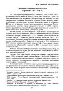 О.Б. Ржевская, Б.Н. Ржевский Особенности военного положения Кировска в 1941-1945 гг. По Указу Президиума Верховного Совета СССР от 22 июня 1941 г. Мурманская область вошла в число 25 областей и республик Союза, где было введено военное положение. Приграничные бои начались по трем направлениям: Мурманск, Кандалакша и Лоухи. Кировск же сразу оказал ся в ближнем тылу, поскольку до линии фронта расстояние не превышало 200 км, что не являлось препятствием для авиации противника. Военно стратегическое значение города определялось тем, что он к 1941 г. превра тился в крупный индустриальный центр, производственные мощности ко торого можно было использовать для военных целей. Как ни странно, но тема «Кировск в годы войны» долгое время не получала должного освещения в печати. В библиографическом указателе «Комбинат “Апатит”», вышедшем в 1972 г., имеется ссылка только на две газетные заметки1. Столько же заметок содержит указатель 1981 г., но с упоминанием брошюры, где на 14 страницах впервые приведен список ки ровчан, погибших на войне'. Указатель литературы по ОАО «Апатит» за 1999 г. вообще игнорирует военную тематику3. До 14 источников увеличе но количество публикаций в указателе за 2001 г., но опять же что только газетные заметки^ Конечно, нет оснований преувеличивать вклад Кировска в победу, но и вообще не упоминать о нем, как это делается в книге «Война в Заполя рье», вряд ли справедливо" Первая и пока единственная публикация научного характера появи лась в 1990 г. отдельной главой в книге «Гигант в Хибинах»6. Помимо по нятного ограничения тематики рамками комбината «Апатит», следует от метить неполноту использованных архивных и печатных материалов, спорность ряда утверждений. В последнее время появились издания, позволяющие расширить на ши представления о положении Кировска и кировчан в годы войны, уточ нить даты, внести поправки в количественные показатели и в полной мере Комбинат «Апатит»: Библиографический указатель советской литературы 1929— 1968 гг. - Кировск, 1972. 2Кировск: Краткий рекомендательный указатель литературы Кировск, 1981. ОАО «Апатит» - 70 лет: Краткий рекомендательный указатель литературы. - Ки ровск, 1990. Кировску - 70: Рекомендательный указатель литературы. Кировск, 2001. Киселев А.А. Война в Заполярье. - Мурманск, 1995. 6 Барабанов А.В Калинина ТА ., Киселев АА ., Краснобаев А.И. Гигант в Хибинах: История открытою акционерного общества «Апатит», - М., 1999. 146