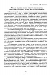 Г.М. Ржевская, Б.Н. Ржевский «Малые» рудники треста «Апатит» как попытка комплексного освоения минеральных богатств Хибин Хибинский горный массив известен своими уникальными месторожде­ ниями апатитовых руд. Один из гигантов отечественной промышленности ОАО «Апатит», добывающий это ценное сырье уже 75 лет, с самого начала пытался наладить комплексное освоение минеральных богатств Хибинского горного массива. Вот почему в окрестностях тогдашнего города Хибиногорска возникли такие рудники, как молибденовый, ловчорритовый, пирротиновый, сфеновый, уртиговый. Планы на будущее строились грандиозные, но все на­ чинания заглохли еще в довоенное время. Даже в официальной биографии ОАО «Апатит» (книга «Гигант в Хибинах», 1999) несколько строчек уделено лишь сфеновому и ловчорритовому рудникам. Между тем это небезынтерес­ ная история поисков и ошибок, мужества и тяжелого труда тех людей, которые достойны того, чтобы память о них не исчезла бесследно. Месторождение молибдена на горе Тахтарвумчорр было открыто в 1925 г. известным исследователем Хибин геологом А.Н. Лабунцовым. Еще до завер­ шения полной разведки месторождения, учитывая, что содержание молибдена в руде доходит до 10%, руководство треста «Апатит» решило начать строи­ тельство рудника и обогатительной фабрики. Первая руда пошла в 1931 г., оп­ равдывая ожидания производственников. Строительство фабрики было запроектировано на берегу озера Большой Вудьявр. Плановая производительность рудника составляла 50 тыс. т руды в год, а ее доставка на фабрику должна была производиться по канатной под­ весной дороге. Этим надеждам не суждено было сбыться, потому что в 1934 г., когда за­ вершили окончательный подсчет запасов, выяснилось, что геологоразведчики сильно ошиблись. Окончательное количество металла составило всего 12 т при среднем его содержании в руде 0,2%, и рудник прекратил свое существование. В настоящее время на территории бывшего рудника, расположенного в ледниковых цирках бассейна озера Малый Вудъявр, находится 5 штолен, со­ единенных штреками, ортами и восстающими с остатками горного оборудова­ ния. Сохранились также выбитые в отвесных скалах узкие полки-тропы, по которым ходили горняки на высоте 700 м над дном долины. Неизвестный ранее науке минерал ловчоррит был найден в 1922 г. на го­ ре Ловчорр геологом Н.Н. Гутковой, но его промышленное месторождение вскоре обнаружили на горе Юкспор в скальных обнажениях правого борта в ущелье Гакмана. Первые разведочные штольни, заложенные в 1931 г., показа­ ли достаточную рентабельность эксплуатации месторождения, поэтому его ос­ воение шло быстрыми темпами. К 1934 г., когда запасы ловчоррита были оце­ нены в 2 328 т при содержании в руде от 0,04 до 8%, его добычу вел рудник, а 120