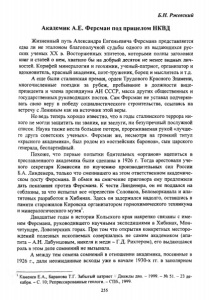 Б.Н. Ржевский Академик А.Е. Ферсман под прицелом НКВД Жизненный путь Александра Евгеньевича Ферсмана представляется едва ли не эталоном благополучной судьбы одного из выдающихся рус­ ских ученых XX в. Восторженных эпитетов, которыми полны заголовки книг и статей о нем, хватило бы на добрый десяток не менее видных лич­ ностей. Корифей минералогии и геохимии, ученый-патриот, организатор и вдохновитель, красный академик, поэт-труженик, борец и мыслитель и т.д. А еще были сталинская премия, орден Трудового Красного Знамени, многочисленные поездки за рубеж, пребывание в должности вице- президента и члена президиума АН СССР, масса других общественных и государственных руководящих постов. Сам Ферсман не уставал подчерки­ вать свою веру в победу социалистического строительства, ссылаясь на встречу с Лениным как на источник этой веры. Но ведь теперь хорошо известно, что в годы сталинского террора ни­ кого не могли защитить ни звания, ни заслуги, ни безупречный послужной список. Наука также несла большие потери, прореживаемая рукой «лучше­ го друга советских ученых». Ферсман же, несмотря на громкий титул «красного академика», был родом из «остзейских баронов», сын царского генерала, беспартийный, Похоже, что первые попытки бдительных «органов» вцепиться в прославленного академика были сделаны в 1926 г. Тогда арестовали уче­ ного секретаря Комиссии по изучению производительных сил России Б.А. Линденера, только что сменившего на этом ответственном академиче­ ском посту Ферсмана. В обмен на смягчение приговора ему предложили дать показания против Ферсмана. К чести Линденера, он не поддался на соблазны, за что испытал все «прелести» Соловков, Беломорканала и апа­ титовых разработок в Хибинах. Здесь он задержался надолго, оставшись в памяти старожилов Кировска организатором горнохимического техникума и минералогического музея1. Двадцатые годы в истории Кольского края накрепко связаны с име­ нем Ферсмана, руководившего научными экспедициями в Хибинах, Мон- четундре, Ловозерских горах. При том что открытия конкретных месторо­ ждений полезных ископаемых совершались не самим академиком (апа­ тита - А.Н. Лабунцовым, никеля и меди - Г.Д. Рихтером), его выдающаяся роль в этом деле сомнений не вызывала. А между тем семена сомнений в отношении академика, посеянные в 1926 г., дали неожиданные всходы уже в начале 1930-х гг. в заполярном 1Каменев Е.А., Баранова Т.Г. Забытый патриот Дважды два. - 1999 - № 51. - 23 де­ кабря. - С. 10; Репрессированные геологи. - СПб., 1999. 255