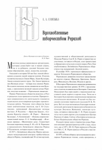 А. А. САМСЫКА Вдохновленные творчеством РерихоВ Дума о Культуре есть врата в будущее. Н. К. Рерих М ногочисленные рериховские организации, которые существуют как в нашей стране, так и за рубежом, уделяют большое вни ­ мание образованию, науке, искусству, культуре. Ушедший в историю XX век был эпохой обога ­ щения сознания людей новыми идеями. В жизнь человечества вошли Знамя Мира, Знамя Культуры, Знамя созидательного труда. Это Знамя принесла нам Великая семья — четверо под именем Рерих. На планете началось целое движение во имя Куль ­ туры, с признанием великой миссии семьи Рери ­ хов, получив название — Рериховское движение. Первое Рериховское общество родилось в Риге в тридцатых годах прошлого столетия. Приоритет ­ ным направлением его деятельности становятся издательское дело и широкая культурно-просвети ­ тельская работа. Членами этого общества были такие замечательные писатели, как С. В. Стуль- гинскис, написавший «Космические легенды востока», Р. Рудзитис — «Братство Грааля», «Со ­ знание Красоты спасёт», «Н. Рерих — Водитель Культуры», А. Клизовский - «Основы миропони ­ мания новой эпохи», Е. А. Зильберсдорф — «В по ­ исках правды», «Воспитание духа». Существует большая переписка между Е. И. и Н. К. Рерихами и председателем Латвийского общества Рериха Р. Рудзи гисом, которая издана в двух томах. В 1937 г. Латвийское общество Рериха органи ­ зовало международный конгресс прибалтийских обществ Рериха, посвящённый 50-летию научной. художественной и общественной деятельности Николая Рериха. Сам Н. К. Рерих в торжествах не участвовал, оставался в Индии, а все приветствия и обращения к нему шли со всего мира в Ригу. Они опубликованы Латвийским Рериховским обще ­ ством в так называемой «Золотой книге». В декабре 1938 г. произошло официальное от ­ крытие Эстонского Рериховского общества. Рериховское движение получило продолжение во многих странах: Франции, Британии, Болга ­ рии, Финляндии, Японии, Италии и других. В Болгарии Рериховское движение развивалось на государственном уровне. В 1978 г. празднова ­ лось столетие независимости Болгарии. Святослав Николаевич был приглашён с персональной вы ­ ставкой своих картин и картин отца. Тогда же в Болгарии была принята национальная программа эстетического воспитания. И целый год был по ­ свящён изучению творческого наследия Н. К. Ре ­ риха. Всё это стало возможным благодаря подвиж ­ нической деятельности председателя Комитета по культуре Людмилы Живковой, министра куль ­ туры, историка и философа. С. Н. Рерих подарил тогда часть своих картин для создаваемого Центра Рерихов в Софии. Сейчас в Болгарии успешно ра ­ ботает Национальное общество Рерихов. В нашей стране идеи и творчество семьи Рери ­ хов начинают распространяться в 60-е годы, после того, как в 1957 г. Ю. Н. Рерих вернулся в Россию и в 1960 г. С. Н. Рерих приехал в Россию с выстав ­ ками картин. В 1959 г. в Новосибирске организовываются регу ­ лярные Рериховские чтения, слайд-программы, в