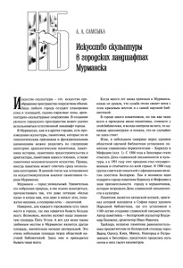 к. А. САМСЫКА Искусство скульптуры 6 городских ландшафтах Мурманска И скусство скульптуры — это искусство пре ображения пространства посредством объема. Лицо любого города создают планировка улиц и площадей, садово-парковые зоны, архи тектурно-скульптурные сооружения. В создании уютного городского пространства может удачно использоваться естественный ландшафт города. В Мурманске, как и в других городах, есть про изведения скульптуры, памятники, которые по их типологическим признакам и функциональным назначениям можно разделить на следующие категории: археологические памятники, памят ники истории, памятники градостроительства и архитектуры, памятники науки и техники, а также памятники монументального искусства. Правда, иногда памятник может отвечать сразу несколь ким категориям. В данной статье мы остановимся на искусствоведческом анализе памятников го рода Мурманска. Мурманск — город уникальный. Удивительна его неброская природа, в нее нужно всмотреться, прочувствовать так, что даже летящие «белые мухи» в конце мая, или даже в начале лета, пока жутся милыми, а полярная ночь — сказочной. Наверное, для каждого горожанина есть такое место в городе, где ему нравится бывать больше всего. Возможно, многие назовут нашу знамени тую площадь Пять Углов. А вот для меня таким любимым местом в Мурманске является другая площадь, значительно меньше центральной. Это очень небольшая площадь перед областной на учной библиотекой. Здесь мне и приходится бывать чаще всего. Когда много лет назад приехала в Мурманск, никак не думала, что судьба тесно сведет меня с этим красивым местом и с самой научной биб лиотекой. В городе много памятников, но так как чаще всего я проходила мимо памятника, стоящего у этой библиотеки, и всегда смотрела на него, то од нажды «рассмотрела» и поняла, что не случайно он здесь стоит. Итак, в небольшом скверике перед зданием областной научной библиотеки установлен па мятник славянским первоучителям — Кириллу и Мефодию (илл. 1). С 1986 года в Заполярье стали отмечать День славянской письменности и куль туры, а в 1991 году этот праздник стал государст венным и отмечается по всей стране. В 1988 году группа советских писателей с официальным визи том посетила Болгарию. Там и возникла идея подарить городу памятник Кириллу и Мефодию в знак признательности городу и мурманчанам, которые возродили День славянской письменно сти и культуры. Памятник является авторской копией, ориги нал которой находится в Софии перед зданием Народной библиотеки, где его установили к 1100-летию создания славянской письменности. Автор памятника — болгарский скульптор Влади мир Гиновски, архитектор Иван Иванчев. Трейлеру, везшему памятник равноапостоль ным просветителям из болгарской столицы через Варну, Одессу, Киев, Минск, Новгород и Петро заводск в Заполярье, предстояло проделать путь почти в пять тысяч километров.