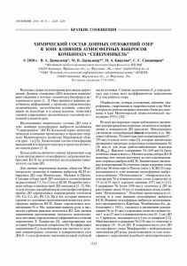 ГЕОХИМИЯ, 2010, № 11, с. 1224-1229 КРАТКИЕ СООБЩЕНИЯ ХИМИЧЕСКИЙ СОСТАВ ДОННЫХ ОТЛОЖЕНИЙ ОЗЕР В ЗОНЕ ВЛИЯНИЯ АТМОСФЕРНЫХ ВЫБРОСОВ КОМБИНАТА “СЕВЕРОНИКЕЛЬ” © 2010 г. В. А. Даувальтер*, М. В. Даувальтер**, Н. А. Кашулин*, С. С. Сандимиров* *Институт проблем промышленной экологии Севера Кольского НЦРАН 184209 Апатиты, Мурманская обл., ул. Ферсмана, 14а; e-mail: vladimir@inep.ksc.ru **ОАО “Кольский геологический информационно-лабораторный центр” (КГИЛЦ) 184209 Апатиты, Мурманская обл., ул. Ферсмана, 26а Поступила в редакцию 17.06.2008 г. Водоемы служат коллекторами всех видов загряз нения. Донные отложения (ДО) водоемов накапли вают сведения о потоках элементов в биосфере в ис торическом срезе [1, 2]. Они являются важным ис точником информации о прошлых климатических, геохимических, экологических условиях, существу ющих на водосборе и в самом водоеме, позволяют оценить современное экологическое состояние воз душной и водной сред. Исследования химического состава ДО озер в зоне влияния атмосферных выбросов комбината “Североникель” (КСН) Кольской горно-металлур гической компании проводились в пределах опор ного Мончегорского полигона Мурманской обла сти (рис. 1 в [3]). Химический состав атмосферных выпадений и поверхностных вод в пределах полиго на описан ранее [3, 4]. Целью работы является оценка загрязнения озер в зоне интенсивного атмосферного загрязнения вы бросами КСН по результатам исследования хими ческого состава ДО. Для оценки загрязнения водных объектов Мон чегорского полигона и влияния выбросов КСН от бирались ДО озер Мончеозеро, Малевое и Пагель. Станции отбора проб ДО находятся соответственно на расстоянии 7.5, 9 и 12км от КСН. Подробно мето дика отбора и анализа проб ДО описана в [5—7]. Ме тодом атомно-адсорбционной спектрофотометрии в пробах ДО определялись концентрации элементов (Ni, Cu, Со, Zn, Pb, Cd, Hg и As), которые являются одними из основных загрязняющих веществ в атмо сферных выбросах КСН. Также определялись кон центрации Fe и Mn, играющих важную роль в про цессах сорбции тяжелых металлов в ДО. Для оценки загрязнения пресноводных экосистем использова лась методика определения коэффициента и степени загрязнения Л. Хокансона [8], адаптированная для условий Европейской субарктики [9]. Коэффициент загрязнения (Cf) подсчитывался как частное от деле ния концентрации элемента в поверхностном слое ДО (0—1см) к фоновому значению в самой глубокой части колонки. Степень загрязнения (Cd) определя лась как сумма всех коэффициентов загрязнения (Cf) для данного озера. Морфология, донные отложения, питание, гид рофизика, гидрохимия и гидробиология озер Мон чегорского района впервые детально были исследо ваны в ходе Мончезерской лимнологической экс педиции 1933 г. [10]. Во всех исследуемых озерах наблюдается увеличе ние концентраций исследуемыхэлементов по направ лению к поверхности ДО (рисунок). Максимальное увеличение концентраций никеля отмечено в оз. Ма левое (таблица). Ni имеет высокие концентрации (87— 270 мкг/л) в воде этого озера [3], которые значительно превышают предельно допустимую концентрацию Ni (10 мкг/л) для воды рыбохозяйственных водоемов (ПДКрбхз). Высокое содержание Ni (169 мкг/л) было отмечено также в воде оз. Малевое вдень отбораДО. В водоемы этот металл поступает за счет аэротехноген- ного переноса выбросов КСН. Значительное увеличе ние концентраций Ni отмечено также в верхних сло