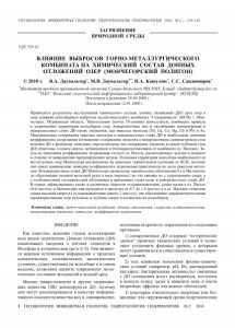 ГЕОЭКОЛОГИЯ. ИНЖЕНЕРНАЯ ГЕОЛОГИЯ. ГИДРОГЕОЛОГИЯ. ГЕОКРИОЛОГИЯ, 2010, № 2, с. 129-139 ЗАГРЯЗНЕНИЕ ПРИРОДНОЙ СРЕДЫ УДК 550.42 ВЛИЯНИЕ ВЫБРОСОВ ГОРНО-МЕТАЛЛУРГИЧЕСКОГО КОМБИНАТА НА ХИМИЧЕСКИЙ СОСТАВ ДОННЫХ ОТЛОЖЕНИЙ ОЗЕР (МОНЧЕГОРСКИЙ ПОЛИГОН) © 2010 г. В.А. Даувальтер*, М.В. Даувальтер**, Н.А. Кашулин*, С.С. Сандимиров* *Институт проблем промышленной экологии Севера Кольского НЦРАН; E-mail: vladimir@inep.ksc.ru **ОАО “Кольский геологический информационно-лабораторный центр ” (КГИЛЦ) Поступила в редакцию 29.09.2008 г. После исправления 12.01.2009 г. Приводятся результаты исследования химического состава донных отложений (ДО) трех озер в зоне влияния атмосферных выбросов медно-никелевого комбината “Североникель” (КСН), г. Мон чегорск, Мурманская область. Многолетняя (почти 70-летняя) деятельность комбината привела к загрязнению территории водосборов озер, поверхностных вод и увеличению концентраций в поверхностных слоях ДО таких элементов, как тяжелые металлы (Ni, Cu, Co, Hg, Cd и Pb) и As. Максимальные содержания тяжелых металлов в поверхностных слоях ДО и наибольшие значения коэффициента загрязнения (отношение содержания элемента в поверхностном сантиметровом слое колонки ДО к фоновому значению, определяемому как содержание элемента в самом глубоком слое ДО) отмечены в самом малом, мелководном и близкорасположенном от комбината оз. Малевое. За тем по значениям коэффициента загрязнения следует оз. Пагель, расположенное дальше и немного в стороне от направления превалирующих ветров. Основная территория водосбора наибольшего из исследуемых озер Мончеозера расположена на довольно значительном удалении от КСН, поэтому оно имеет наименьшие значения коэффициента загрязнения практически по всем тяжелым метал лам. В поверхностных слоях ДО Мончеозера происходит значительное обогащение Fe и Mn (вплоть до образования озерной железной руды в виде корочек), но это связано не с загрязнением озера, а с особенностями геохимической обстановки в придонных слоях воды и поверхностных слоях ДО. В озерах зафиксированы также и различные скорости осадконакопления: самая малая в оз. Пагель (0.4 мм/год), в Мончеозере она находится в пределах от 0.7 до 1.0 мм/год, а в оз. Малевое отмечена самая высокая скорость осадконакопления (около 2 мм/год), что обусловлено морфометрическими характеристиками озер (площадь и глубина озера) и площадью их водосборов. Ключевые слова: медно-никелевый комбинат, донные отложения, скорость осадконакопления, концентрация тяжелых металлов, коэффициент загрязнения. ВВЕДЕНИЕ Как известно, водоемы служат коллекторами всех видов загрязнения. Донные отложения (ДО) накапливают сведения о потоках элементов в биосфере в историческом срезе [13]. Они являют ся важным источником информации о прошлых климатических, геохимических, экологических условиях, существующих на водосборе и в самом водоеме, позволяют оценить современное эколо гическое состояние воздушной и водной сред. Многие микроэлементы и другие загрязняю щие вещества (ЗВ) депонируются ДО, поэтому они могут рассматриваться в качестве информа тивного показателя качества вод и, одновременно, источника вторичного загрязнения по следующим причинам: 1) ненарушенные ДО содержат “исторические записи” прошлых химических условий и позво ляют установить фоновые уровни, с которыми могут сравниваться и сопоставляться сущ