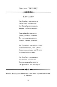 Виталий СЕКРИЕРу ттттттттттттитттттттттмттттттттт еаЬ Н. РУБЦОВУ Ему б любить и ненавидеть. Ему бы пить и не хмелеть. Ему б судьбу свою увидеть, Увидев, чтоб не пожалеть.... А он любил бесповоротно. До дна, до капли и хмелел. Что это зелье приворотно, Не знал, а может, не хотел... Как будто знал, что срок отпущен, Немногим больше, чем Христу... И он спешил, совсем, как Пушкин На речку Черную свою.... Ему б любить и ненавидеть. Ему бы пить и не хмелеть. Он не хотел судьбу увидеть, Как будто знал, что это смерть.... --------------------------------- «<38£эфсЭ8е>=>------------------- --------- Виталий Леонидович СЕКРИЕРУ, член Союза журналистов России, г. Апатиты. 59