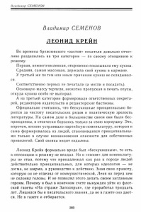 Владимир СЕМЕНОВ Вл а д ими р СЕМЕНОВ ЛЕОНИД КРЕЙН Во в р ем е н а бр ежне вс ко г о «з а с т оя» писа т ели довольно от че т ливо р а з д е л и ли с ь на три ка т е гории — по своему отношению к р ежиму . Пе р в а я , немногочисленная, откровенно пока зыва ла ему кукиш. Ср е дн я я , с а м а я ма с со вая , д е р ж а л а свой кукиш в ка рма н е . У тре тьей ж е по тем или иным пр ичи нам кукиш не с к л а дыв а л - Соо тве т с твенно первых не пе ч а т а ли (а могли и посадить). Основ ную ма с су т ерпели , неохотно пр опус кая в печа ть опусы, от куд а кукиш особо не выпира л . А из тре тье й кат е гории ф о рми р о в а л и ответс твенных с е к р е т а рей, р е д а к т о р о в изд а т ел ьс т в и ре д а к т о р с к и е бастионы. Оф и ц и а л ь н о считалось, что б е с к у кишные пр инципи а л ьн о бо рются за чис тоту пи с а т ельских ря до в и политическую зр елос ть ли т е р а т у ры . На с амом деле в бол ьшин с тв е своем они были б е с принципны , и с тоически боролись только за свою кормушку . Это, впрочем, вполне у с т р а и в а л о п а р т ий н ую номенкла туру , котор ая и с ам а ф о р м и р о в а л а с ь из людей, с т ановившихс я п ри н ц и п и а л ь ны ми только в с л уча е возникновения опа снос ти для собс твенных привиле гий . Свой свояка видит и зд а л е ка . Л е о н и д Кр ейн фо рм а л ь н о вроде был «бе скукишным» , то есть в оппозицию к р ежи м у не вп ад а л . Но и «своим» для номе н к л а т у ры не с т ал , потому что п р и н а д л е ж а л как р а з к породе людей д ей с тв и т е л ьн о принципи а л ьных , дл я которых идеология — не до гма , не ши рма , а руководс тво к действию. З н а я свою правоту , которую он не отде ля л от коммунис тиче ской, .Пеня ни перед кем не скл оня л головы. И не поз волял этого д е л а т ь своим з а г л а в ным г ероям. По ч ему и был в конечном счет е вынужде н уйти из ф л о т ской г аз е ты «Н а с т р а ж е З а п о л я р ь я » , где пр о р а бо т а л т р и д ц а т ь лет. Л иш и л с я бы и пи с а т ельского з в а ни я , да не в г азе те оно д а е т ся. Не в г а з е т е и отби ра е т с я . 289