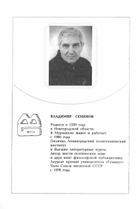 ВЛАДИМИР СЕМЕНОВ Родился в 1939 году в Новгородской области. В Мурманске живет и работает с 1966 года. Окончил Ленинградский политехнический институт и Высшие литературные курсы. Автор шести поэтических книг и двух книг философской публицистики. Лауреат премии университета «Гуманус». Член Союза писателей СССР с 1978 года.