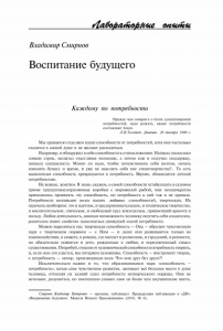 Лабораторные опыты Владимир Смирнов Воспитание будущего Каждому по потребности Прежде чем говорить о благе удовлетворения потребностей, надо решить, какие потребности составляют благо. Л.Н.Толстой. Дневник. 29 декабря 1900 г. Мы привычно отделяем наши способности от потребностей, хотя они частенько сходятся в нашей душе и не желают расходиться. Например, я обнаружил в себе способности к стихосложению. Написал несколько ловких строк, испытал счастливое волнение, а потом еще и получил поддержку, похвалу специалиста. Много ли надо, чтобы почувствовать себя поэтом, начать изводить бумагу и время, и уже не мыслить себя вне стихотворчества?.. То есть выявленная способность превращается в потребность. Вернее, обзаводится личной потребностью. Не всякая, заметим. Я знаю, скажем, о своей способности штабелевать в судовом трюме тридцатикилограммовые коробки с мороженой рыбой, мне неоднократно приходилось проявлять эту способность, но потребность к ней так и не пришла. Потребности возникают возле наших любимых способностей, творческих. Их перечень необозрим: это и научное, и предпринимательское, и техническое творчество, и воспитательское, этическое, и свободный труд земледельца, приносящий красоту и пользу. Любая деятельность, дающая возможность человеку ощутить себя создателем, родителем имеет свойство наполняться движущей силой потребности. Можно выразиться так: творческая способность —Она —образует чувственную пару с творческим порывом — с Ним — и далее они развиваются только во взаимодействии, в сюжете, в романе, где хватает и размолвок, и страданий, и ревности, но обязательно появятся и дети, рожденные в любви, и опредмеченный смысл существования. Попробуй, отщепи от художнической способности потребность творить, и, если нам это удастся, мы потеряем художника. Способность —инструмент творца, а потребность — мотор, производящая воля. Что они друг без друга?! Исключительно важно и то, что образовавшаяся пара «способность — потребность», начав свое чувственное развитие, занимает всё большее место в душе человека, оттесняя на задний план потребности нетворческого порядка. Они не исчезают, разумеется, но постепенно узнают свое не более чем подчиненное место, Смирнов Владимир Петрович — прозаик, публицист. Предыдущая публикация в «ДН»: «Вызревание будущего. Модель Нового Просвещения» (2019, № 6).