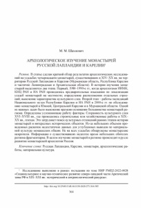 М. М. Шахнович АРХЕОЛОГИЧЕСКОЕ ИЗУЧЕНИЕ МОНАСТЫРЕЙ РУССКОЙ ЛАПЛАНДИИ И КАРЕЛИИ1 Резюме. В статье сделан краткий обзор результатов археологических исследова­ ний на усадьбах четырнадцати монастырей, существовавших в XIV-XX вв. на тер­ ритории Русской Лапландии и Карелии (Мурманская область, Республика Карелия и частично Ленинградская и Архангельская области). В истории изучения мона­ стырей выделяются два этапа. Первый, 1980-1990-е гг., когда археологами ИИМК, КНЦ РАН и ИА РАН проводились предварительные изыскания по локализации усадеб монастырей на местности; определение расположения отдельных строе­ ний; выяснение характеристик культурного слоя. Второй этап - работы экспедиций Национального музея Республики Карелия и ИА РАН в 2000-е гг. по обследова­ нию монастырей в Южной, Центральной Карелии и в Мурманской области. Одной из важных задач было выяснение времени основания большинства монастырей ре­ гиона. Определены усложняющие работу факторы. Сохранность культурного слоя XVI-XVIII вв., где проводились строительные или хозяйственные работы в XIX- ХХ вв., плохая. Это затрудняет поиск культурных отложений ранних этапов истории монастырей и интересных исторических объектов. Из-за небольших объемов про­ веденных раскопок недостаточно данных для углубленных выводов по материаль­ ной культуре монашеских общин. Не на всех усадьбах обнаружены монастырские некрополи. Информация о существовавших недолгое время небольших обителях региона фрагментарна. В целом изучение монастырей в регионе происходит в русле развития монастырской археологии России. Ключевые слова : Русская Лапландия, Карелия, монастыри, археологические ра­ боты, материальная культура. 1 Исследование выполнено в рамках госзадания по теме НИР FMEZ-2022-0028 «Социокультурное и научно-техническое развитие северо-западной части Арктической зоны РФ в XIX-XXI вв.: исторический и антропологический ракурсы». http://doi.org/10.25681/IARAS.0130-2620.271.364-385 364
