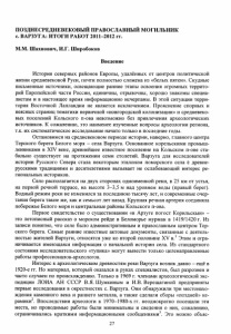 ПОЗДНЕСРЕДНЕВЕКОВЫЙ ПРАВОСЛАВНЫЙ МОГИЛЬНИК с. ВАРЗУГА: ИТОГИ РАБОТ 2011-2012 гг. М.М. Шахнович, И.Г. Широбоков Введение История северных районов Европы, удалённых от центров политической жизни средневековой Руси, почти полностью сложена из «белых пятен». Скудные письменные источники, освещающие ранние этапы освоения огромных террито­ рий Европейской части России, единичны, отрывочны, хорошо знакомы специа­ листам и в настоящее время информационно исчерпаны. В этой ситуации терри­ тория Восточной Лапландии не является исключением. Прояснение спорных и неясных страниц тематики первичной «новгородской колонизации» и средневеко­ вых поселений Кольского п-ова невозможно без привлечения археологических источников. К сожалению, это наименее изученные вопросы археологии региона, т.к. их систематическое исследование начато только в последние годы. Остановимся на средневековом периоде истории, наверно, главного центра Терского берега Белого моря - села Варзуга. Основанное корельскими промыш­ ленниками в ХГѴ веке, древнейшее известное поселение на Кольском п-ове ста­ бильно существует на протяжении семи столетий. Варзуга для исследователей истории Русского Севера стала некоторым эталоном поморского села е древне­ русскими традициями и десятилетиями вызывает не ослабевающий интерес ре­ гиональных историков. Село располагается на двух сторонах одноименной реки, в 25 км от устья, на первой речной террасе, на высоте 3-3,5 м над уровнем воды (правый берег). Водный режим реки не изменился за последнюю тысячу лет, и современные очер­ тания берега такие же, как и семьсот лет назад. Крупная речная артерия соединяла побережье Белого моря и центральные районы Кольского п-ова. Первое свидетельство о существовании «в Арзуге погост Корильскыи» - это летописный рассказ о морском рейде в Беломорье мурман в 1419/1420 г. Из записи понятно, что село было административным и православным центром Тер­ ского берега. Самые ранние известные актовые документы, связанные с деятель­ ностью жителей Варзуги, относятся уже ко второй половине XV в.1Этим и огра­ ничивается имеющаяся информация о начальной истории села. Из стандартного состояния исследовательского «тупика» могут вывести только целенаправленные работы профессионалов-археологов. Интерес к археологическим древностям реки Варзуга возник давно - ещё в 1920-е гг. Но материал, который оказался в руках специалистов, был разрознен и часто случаен по происхождению. Только в 1969 г. членами археологической экс­ педиции ЛОИА АН СССР В.Я. Шумкиным и И.В. Верещагиной предприняты первые исследования в окрестностях с. Варзуга. Они обнаружили три местонахо­ ждения каменного века и раннего металла, а также сделали сборы «поздней» ке­ рамики2. Впоследствии археологи в 1970-1980-х гг. неоднократно посещали эти места, но проводимые работы были минимальны и сведения о них, сожалению, ограничивались краткими информационными сообщениями3. Это можно объяс­ 27