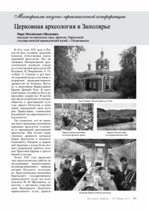 О т о ш ^ ш » намыо>-?1/шктияе<жой tccwjbe/ieHtfruu Церковная археология в Заполярье Марк Михайлович Шахнович, кандидат исторических наук, археолог, Карельский государственный краеведческий музей, г. Петрозаводск В 60-е годы XIX века в Рос сии на базе духовных академий возникла отечественная школа церковной археологии. Под па тронажем Императорской архе ологической комиссии класси ки отечественной археологии (Н. Кондаков, Н. Покровский, А. Го лубцов, А. Спицын и др.) внес ли огромный вклад в изучение и сохранение раннехристианских древностей на Ближнем Восто ке и памятников Православной Церкви Древней Руси. В совет ский период эти работы были ре прессивно «свернуты». В настоя щее время возрождается интерес общества к христианской куль туре нашего Отечества и пони мание неразрывной связи исто рии Православия, становления российской государственности и менталитета. Так сложилось, что по своим научным принципам российская церковная археология отличает ся от европейской христианской археологии. Она изучает веще ственные древности методами общей археологии в контексте Священного Писания и церков ной традиции с целью более пол ного разрешения проблем исто рии Христовой Церкви и христи анской культуры. Летом 2010 года продолжи лись археологические работы по исследованию малоизученного позднесредневекового периода истории Кольского полуостро ва. Археологическая экспедиция Карельского государственного краеведческого музея под руко водством М. М. Шахновича, со вместно с научными сотрудни ками Мурманского областного краеведческого музея, провела Борисоглебские раскопки на месте древнего храма Борисоглебский храм на пограничной реке Паз Во время Борисоглебских раскопок Под сенью Трифона | №1 Январь 2011 41