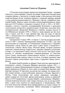 Е.Н. Шталь Академик Гамов на Мурмане С Кольским полуостровом связано имя академика Гамова - всемирно известного ученого-физика. Георгий Антонович Гамов внес большой вклад в ядерную физику, в частности, в теорию альфа- и бета-распада (облучение альфа-частицами легких элементов привело к открытию ядерных реакций и искусственной радиоактивности). Принимал участие в разработке водо родной бомбы. Являлся самым молодым членом-корреспондентом Акаде мии наук СССР (избран в Академию в возрасте 28 лет, в 1932 г.). В 1946 г. выдвинул гипотезу «горячей» расширяющейся Вселенной и предсказал существование реликтового радиоизлучения. Реликтовое излучение было экспериментально обнаружено Пензиасом и Райлом, которые получат за это Нобелевскую премию (1978 г.). Вместе с ними премию мог бы полу чить и Гамов, если бы к тому времени был жив (он умер 19 августа 1968 г.). Интересовала его и биофизика: в 1954 г. он сделал первый расчет генетического кода. Гамов родился 4 марта 1904 г. в Одессе. С детства интересовался фи зикой. В 1926 г. окончил Ленинградский университет. В 1928 г. ему дали рекомендацию на стажировку в Геттингенском университете в Германии. Возвращаясь домой, Гамов на свой страх и риск заехал в Копенгаген к знаменитому ученому Нильсу Бору. Молодой физик, который занимался квантовой теорией распада альфа-частиц, произвел приятное впечатление на Бора, и тот предложил Гамову остаться у него на год. Там Гамов позна комился со многими выдающимися учеными-физиками. В Советском Союзе Гамову организовали торжественную встречу «с хлебом-солью». Демьян Бедный даже написал стихи в его честь, в которых «воспевал сына трудового народа, расколовшего ядро атома, и предлагал Западу поосте речься». Во время второй поездки за границу Гамов получил приглашение от итальянского ученого Гульельмо Маркони выступить осенью 1931 г. с докладом на первом Международном конгрессе по ядерной физике. Гамов решил задержаться в Европе до этого срока, но нужно было продлить срок действия паспорта. В советском посольстве ему сказали, что нужно полу чить новый паспорт, а пока необходимо вернуться в Москву. Прилетев в Москву, Гамов почувствовал, как сильно изменилась атмосфера в стране за время его отсутствия. Друзья недоумевали: почему он вернулся? Наука в СССР превратилась в орудие борьбы с капитализмом. Общение с учеными капиталистических стран теперь считалось чуть ли ни преступле нием, а наука стала делиться на «пролетарскую» и «буржуазную». Мар ксистской идеологии обязаны были придерживаться не только ученые, но и писатели, композиторы, художники. Любое отклонение от марксизма 244