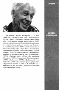 СИНИЦЫН Викдан Викторович (12.04.1934- 2ti.08.2002), писатель, поэт, член Союза писателей России. Родился в Иркутске. Работал в Вологодской обл. в геодезической партии, автослесарем. В 1953 призван в армию, окончил Соловецкий учебный отряд по специальности радист, служил на Северном и Балтийском флотах. В 1957 демобилизовался и ос­ тался на Севере, ходил в море. Писал стихи и прозу. Печатался в журналах «Наш современник», «Роман- газета XX I век», «Север», флотских и скандинавских изданиях. В Мурманске вышли книги «Крик в океане» (1991), «Падение яблок» (1994), «Зал ожидания. Рассказы» (1995), «Л жить надо. Рассказы, очерки» (1998), «Бабье лето» (1998), «Проблесковый огонь надежды» (2001) и др. Лауреат премии губернатора Мурманской области за 2001 г. В 2001-2002 г.г. в течение семи мес. возглавлял Мурманское отделение Союза писателей России. Поэзия Викдан СИНИЦЫН