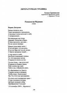 ЛИТЕРАТУРНАЯ СТРАНИЦА Галина СиротинскаЯ журналист Введенского храма г. Мурманск, Россия Романов-на-Мурмане стихи Первая Литургия Златые теплятся леса: Горят прощаньем и прощеньем, А молодые голоса восходят к небу. С возвращеньем... На пепелищах мы стоим Церквей, Отечества и Веры, И тени прошлого, как дым... Но не сумели изуверы Живые души наши сжечь - И тот же крест, и та же речь, И тот же Царь всё так же людям С Креста прощенье подаёт... А хор ликует и поёт, Как будто возрождает словом То, что порушено мечом И мерзости печать на чем. Где мы стоим - там пусто всё И раньше не бывало храма. Поёт и ветер про своё, Поём и мы, собравшись рано, И, обратившись ко Христу, Усердно молим и взываем, Чтобы помог, благословил Нас Тот, Кого мы прославляем И в честь кого воздвигнем храм - О чем и молимся сегодня, Да будет возведен собор Преображения Господня! (16 сентября 2000 г., Мурманск) 195