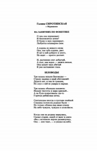 Галина СИРОТИНСКАЯ г. Мурманск НА ЗАНЯТИЯХ ПО ФОНЕТИКЕ О чем она переживает И беспокоится зачем? И букву в звук перевирает, Любуется кошмаром схем. А корень из живого слова Она, как зуба корень, рвет. И нет в ней доброго и злого, Не ищет — просто достает. И, расчленяя слог добытый, А слог, как вздох — делить нельзя, Она целует звук убитый В уже застывшие глаза. БЕЛОВОДЬЕ Три казака искали Беловодье — Страну надежд и край обетований: Дороги нет, и лик ее туманен, Но слух о ней не умирал в народе. Три казака объехали полсвета: Искали чистоты и веры крепкой... А на Руси подрагивала где-то Горячая рябиновая ветка. Скитальцам иногда в пустыне знойной Слышны колокола родные были — Но только облака над ними плыли На небе чуждом, чуждом и спокойном. Когда они на родину вернулись, Сказал старик, седой от вьюг и снега: «Вы с истинною верою разминулись, Она — вон там», — и указал на небо.