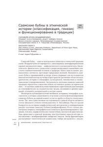 № 2 2020 ВРЕМЕННИК ЗУБОВСКОГО ИНСТИТУТА Саамские бубны в этнической истории (классификация, генезис и функционирование в традиции) СОЛОВЬЁВ ИГОРЬ ВЛАДИМИРОВИЧ Кандидат искусствоведения, доцент кафедры музыки финно-угорских народов, Петрозаводская государственная консерватория имени А. К. Глазунова (Петрозаводск, Россия) SOLOVIEV IGOR V. PhD (History of Art), Associate Professor, Department of Finno-Ugric Music, Petrozavodsk State Glazunov Conservatoire (Petrozavodsk, Russia) E-mail: hopes71@yandex.ru Саамский бубен — один из центральных символов в этнической традиции саами. Недаром бубен ассоциируется с многомерной и многофункциональной картой лапландского мира — мифологического и космогонического, биоло- гического, физического, социального, репрезентирующего важнейшие кон- станты взаимоотношений человека и природы: поиск смысла жизни, раз- мышления о вечности, круговорот природных явлений. Значимость саам- ского бубна в традиционной культуре этноса открывает для исследователя многоаспектный вектор изучения в пространстве различных областей наук: археологии, истории и этнографии, культурологи, лингвистики и этному- зыкологии (этноорганологии). Актуальность изучения символа саамской традиции определена в многочисленных источниках разных исторических эпох — от полевых записей путешественников и христианских миссионеров до этнографических исследовательских трудов, касающихся древних веро- ваний, духовной и материальной культуры саамов. Несмотря на публикации путешественников, историков, этнографов, куль- турологов, в которых затрагиваются отдельные аспекты функционирования саамских бубнов, на данный момент остается пробел в области этномузыко- логии. Так, пока единственным исследованием в данной области являются статьи шведского ученого-этномузыколога Э. Эмсхаймера. Ряд его трудов базируется на историко-морфологической методологии в компаративном ракурсе изучения саамских бубнов (мембранофонов). В его статьях рас- смотрены вопросы этнографического контекста функционирования в тра- диции, генезиса, морфологических типов бубнов, магической практики вы- бора древесины в саамской традиции, конструктивных параллелей при со- поставлении с мембранофонами сибирских этносов. Автор фрагментарно рассматривает гипотетическую взаимосвязь тембра инструмента с локали- УДК 781.7